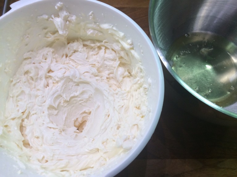 Valmista täyte. Laita liivatelehdet likoamaan kylmään veteen. Vaahdota kerma. Lisää joukkoon tomusokeri. Sekoita kermavaahtoon mascarpone-juusto. Vatkaa vielä valkuaiset omassa kulhossaan vaahdoksi ja lisää vaahto kerma-mascarponevaahtoon. Kiehauta likööri ja sulata joukkoon liivatelehdet. Anna jäähtyä hieman. Sekoita likööri-liivateseos pienissä erissä ohuena nauhana hitaasti vatkaten täytevaahtoon. Kaada vuokaan ja tasoita pinta nuolijalla tai lusikalla. Hyydytä jääkaapissa min 3 tuntia tai yön yli. Irrota kakku vuoasta ja siirrä tarjoilulautaselle. Koristele haluamallasi tavalla, meillä kakku tuli tarjolle Tapaninpäivänä, niin koristeina oli vadelmia, boysenmarjoja sekä jouluisia tähtianiksia.