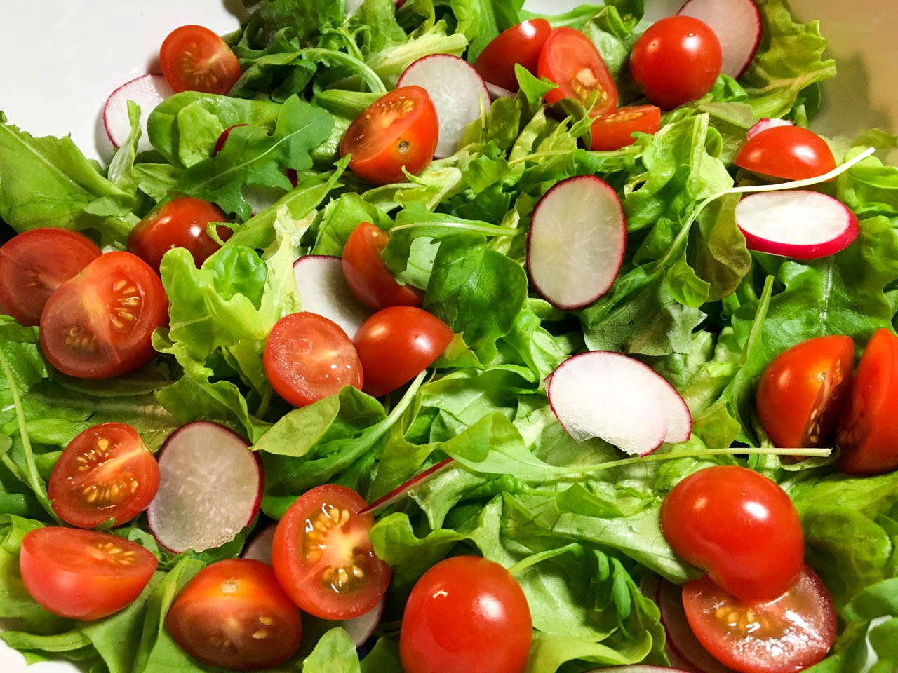 Erilaisia salaatteja, kuten tammenlehvää, rucolaa, romainea