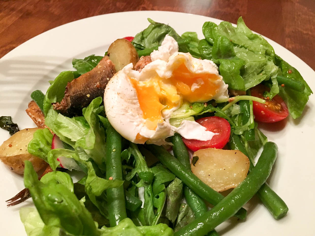 Valmista lopuksi uppomunat. Laita vesi kuumenemaan kattilaan. Riko munat omiin kuppeihinsa. Kun vesi on kiehahtanut lisää joukkoon etikka ja suola. Anna veden kiehua keskilämmöllä. Pyöräytä kauhalla vesi liikkeelle kattilassa ja liutua muna varovasti veteen mahdollisimman läheltä veden pintaa. Keitä noin 3 minuuttia, jos haluat kypsemmän uppomunan, keitä tuplasti pidempään. Nosta valmis muna reikäkauhalla kattilassa ja siisti munan reunat tarvittaessa. Valmista loput munat samalla tavalla. Viimeistele salaatti kastikkeella ja uppomunilla ja rouhi vielä päälle suolaa ja pippuria. Kertakaikkiaan ihana salaatti!