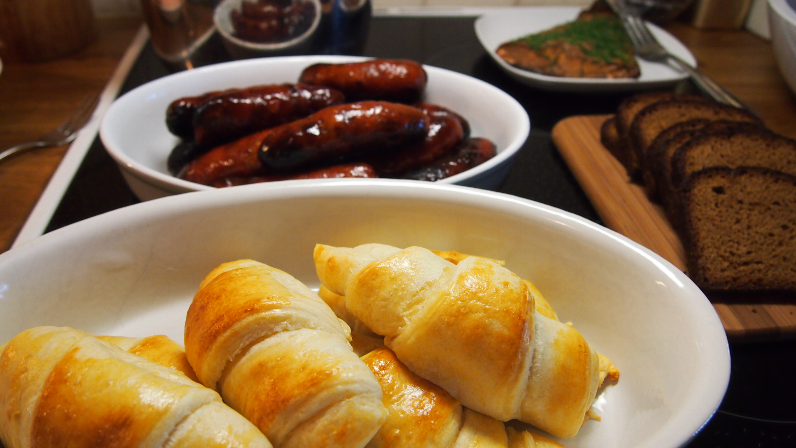 Juustocroissantit syntyvät suoraan purkista, ripottele taikinasiivujen päälle hiukan juustoraastetta ennen croisantin rullausta. Paista purkin ohjeen mukaan.