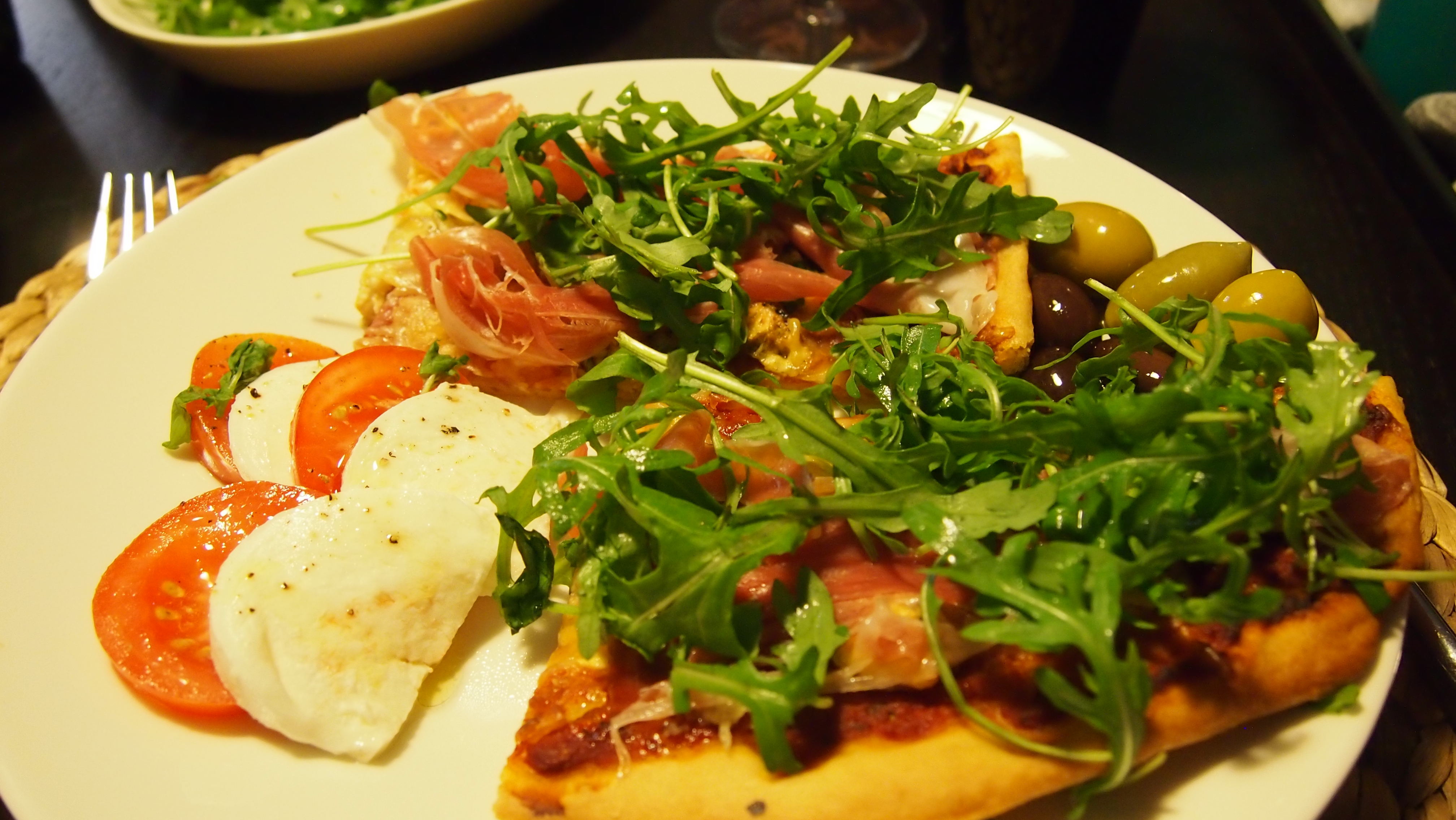 Tomaattikastike tehtiin tomaattipyreestä ja murskasta. Siihen lisättiin tuoretta basilikaa, timjamia ja valkosipulia.Täytteinä meillä oli herkullista italialaista salamia, tuoreita herkkusieniä, aurajuustoa, parmankinkkua ja rucolaa. Lapselle perinteinen kinkku-ananaspizza. Parmankinkku ja rucola lisättiin vasta paiston jälkeen, eli ensin muut täytteet, päälle mozzarellaa ja juustoraastetta ja uuniin. Paista pizzaa 250 asteessa n. 15 min. Meillä oli kolme peltiä ja kiertoilmauuni, joten nämä olivat n. 220 asteessa n. 20 min. Paiston jälkeen asetellaan parmankinkut ja rucolat päälle, sekä valkosipuli-yrttiöljyä täydentämään maku. Pizzan kaverina pöydässä oli raikas tomaatti-mozzarella-salaatti sekä mustia ja vihreitä oliiveja. Täytyy sanoa että tämä pizza oli jokaisen ruokailijan mielestä aika lailla täydellistä!