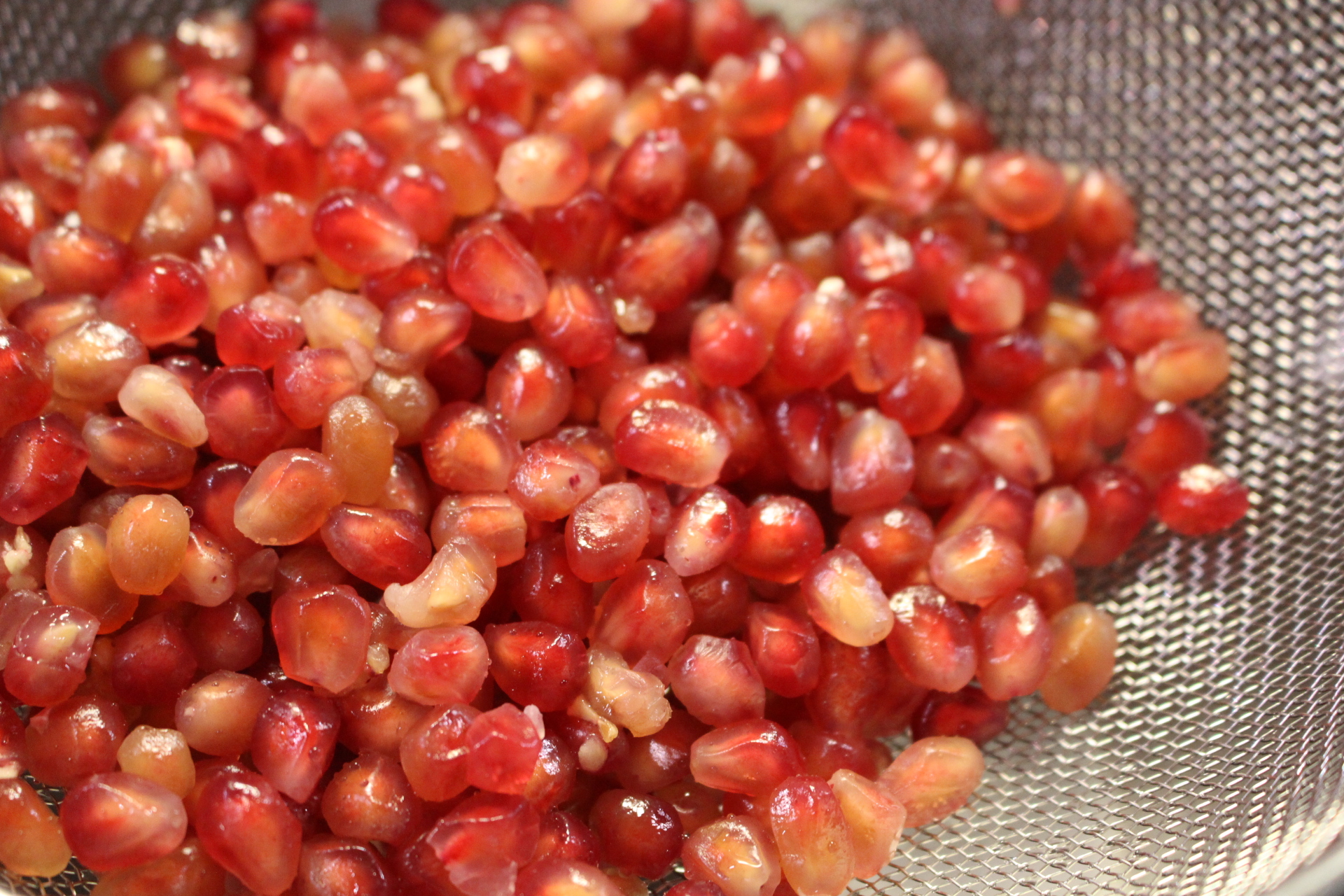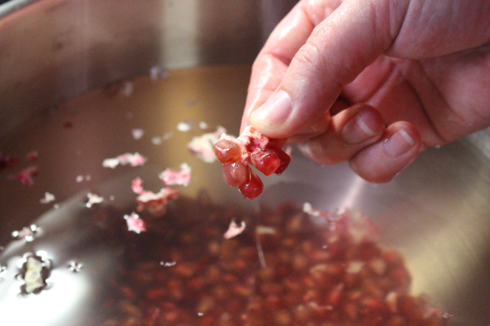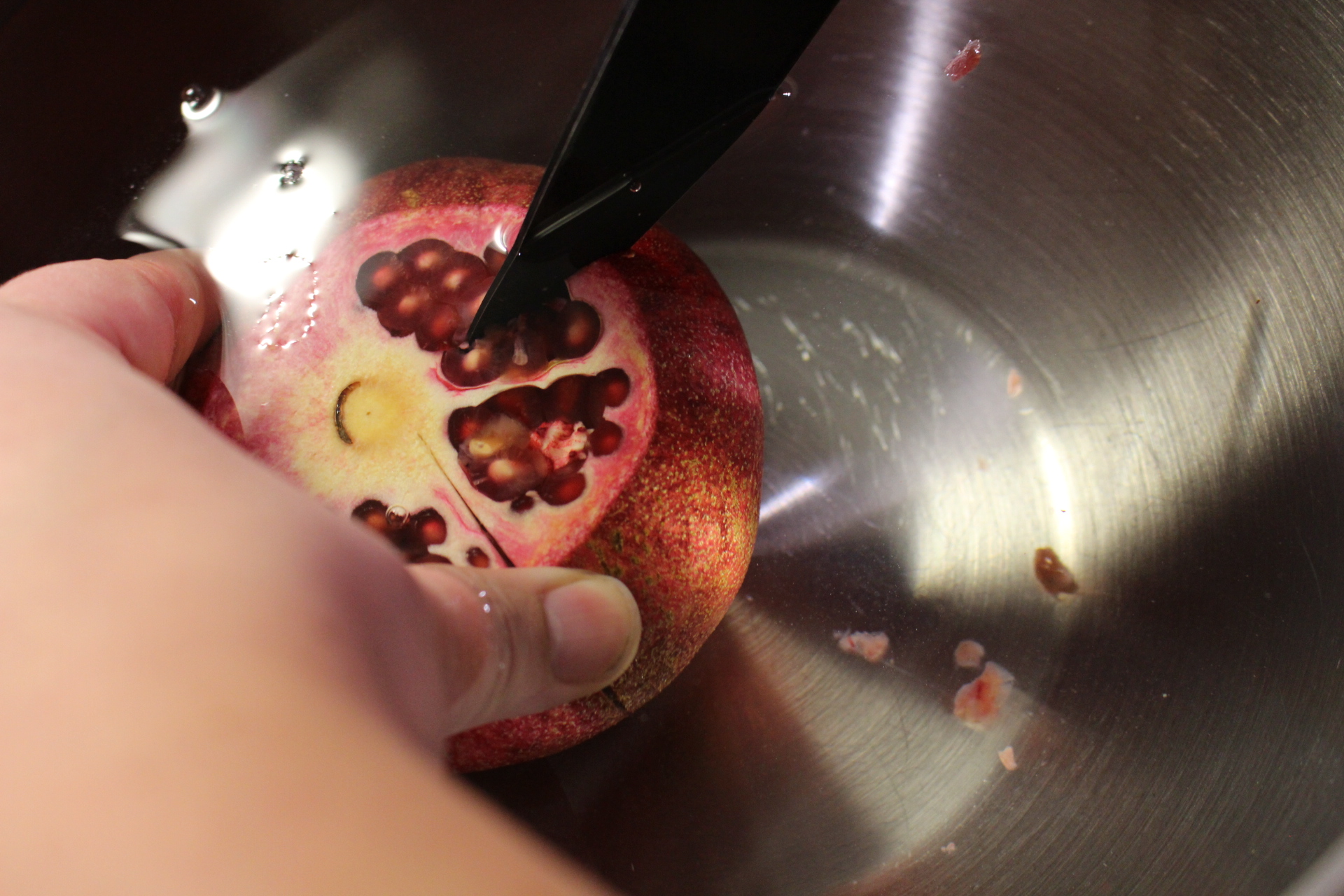 Vinkki jo näin etukäteen! Kun irrotat granaattiomenan siemenet veden alla isossa kulhossa, säästyt suuremmalta sotkulta keittiössä. Granaattiomena on huikean mehukas ja kuoriessa mehua tuppaa tirskumaan joka suuntaan. Ei siis vaaleaa paitaa päälle, kun alat käsittelemään granaattiomenaa!