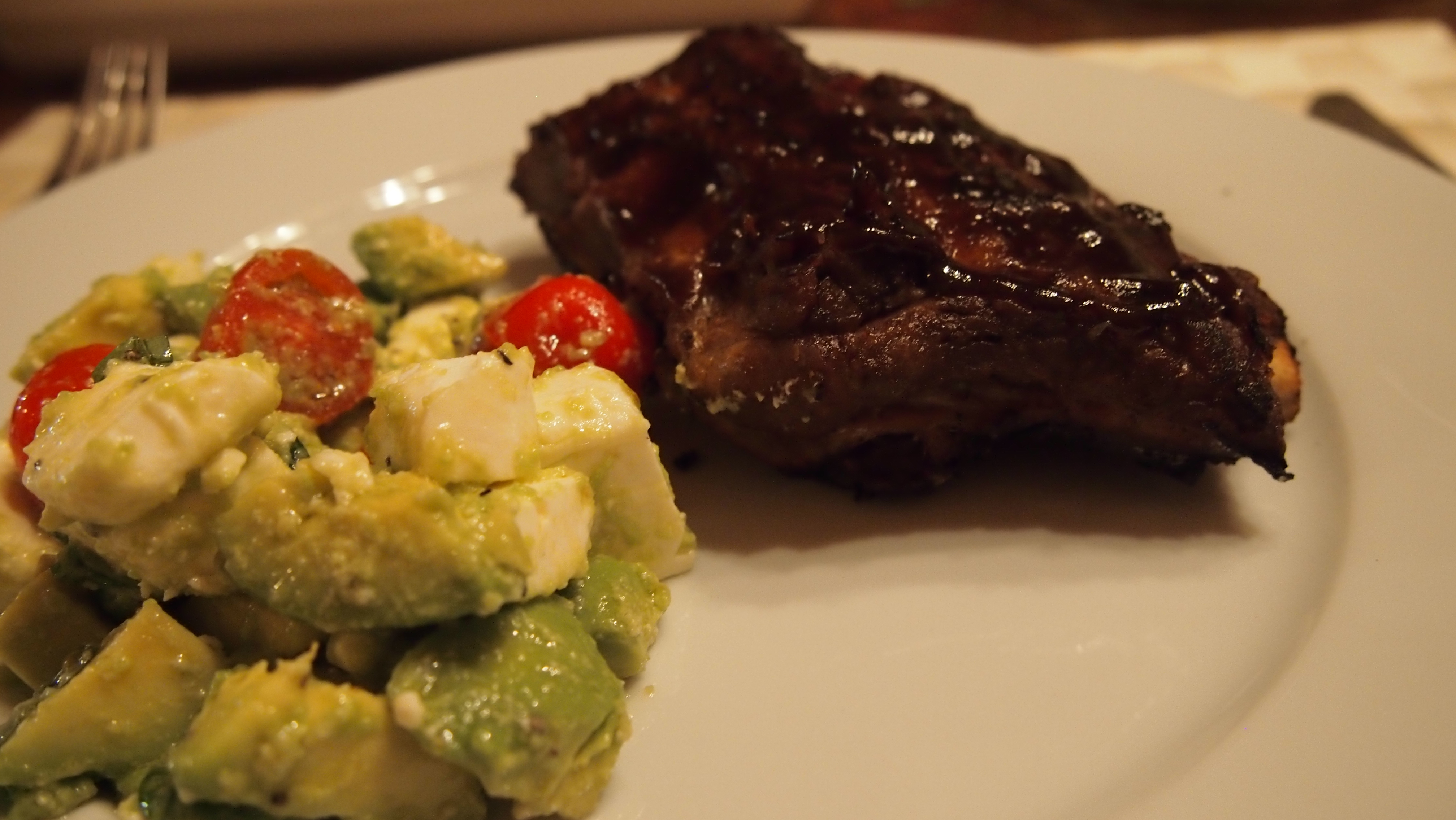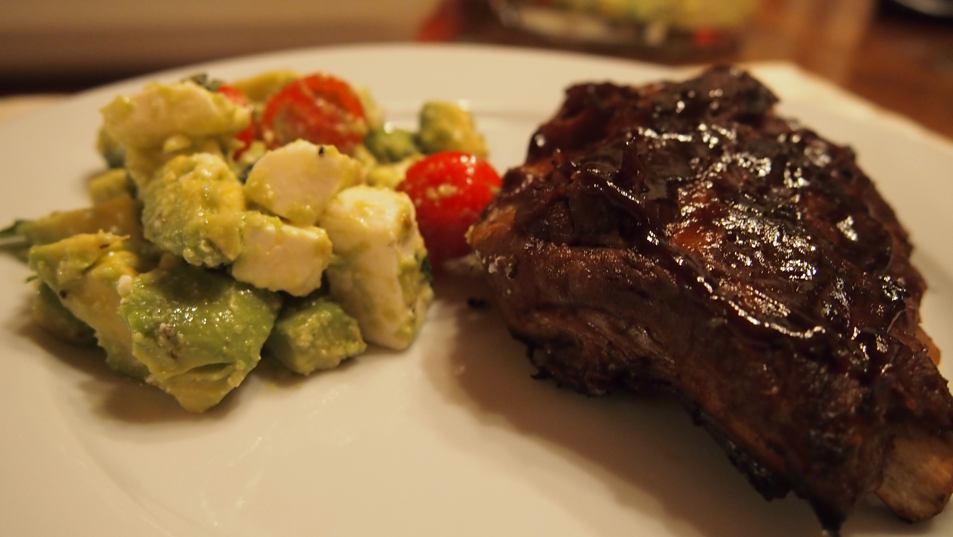 Ennen grillailua sivelimme lihat Santa Marian hickory BBQ soossilla. Kun oikein hifistellään, tehdään BBQ kastike itse, mutta tällä kertaa oikaisimme hiukan. Kesämmällä luvassa varmasti postaus tästäkin versiosta. Santa Marian valmis kastike on erittäin hyvää sekin. Ribsit viimeistellään grillissä, jotta lihoihin saadaan se ihana grillin maku. Grillaa lihoja n. 15 minuuttia välillä kääntäen. Tällä kertaa teimme lisukkeeksi raikkaan tomaatti-avocado-fetasalaatin, jonka ohje on sisareltani peräisin. Pilko tomaatit, feta ja avocado (2 kpl) ja sekoita ne varovasti kulhossa. Lisää joukkoon n. 3 rkl oliivilöjyä, suolaa, mustapippuria sekä pieneksi silputtua basilikaa. Sekoita ja tarjoile heti. Jos tätä herkkua jää yli, kannattaa sekaan puristaa muutama tippa sitruunan mehua, jotta avocadot eivät tummuisi niin paljon.