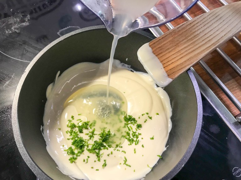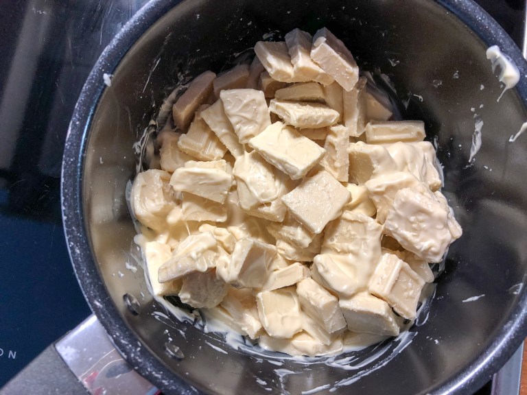 Paloittele suklaa teflon pintaiseen kattilaan ja sulata suklaa miedolla lämmöllä tasaiseksi massaksi. Ole tarkkana, ettei suklaa pääse kärähtämään. Nosta kattila liedeltä.