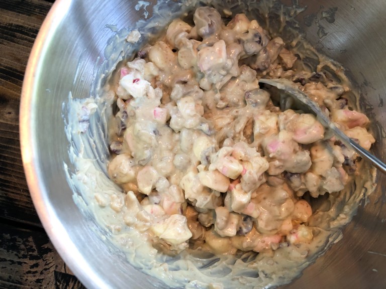 Leikkaa vaahtokarkit saksilla pieniksi palasiksi. Rouhi pähkinöitä ja keksejä hiukan pienemmiksi paloiksi. Säästä vaahtokarkkeja sekä karpaloita myös koristeiksi! Sekoita vaahtokarkit, pähkinät, keksit ja karpalot hiukan jäähtyneen suklaan joukkoon.