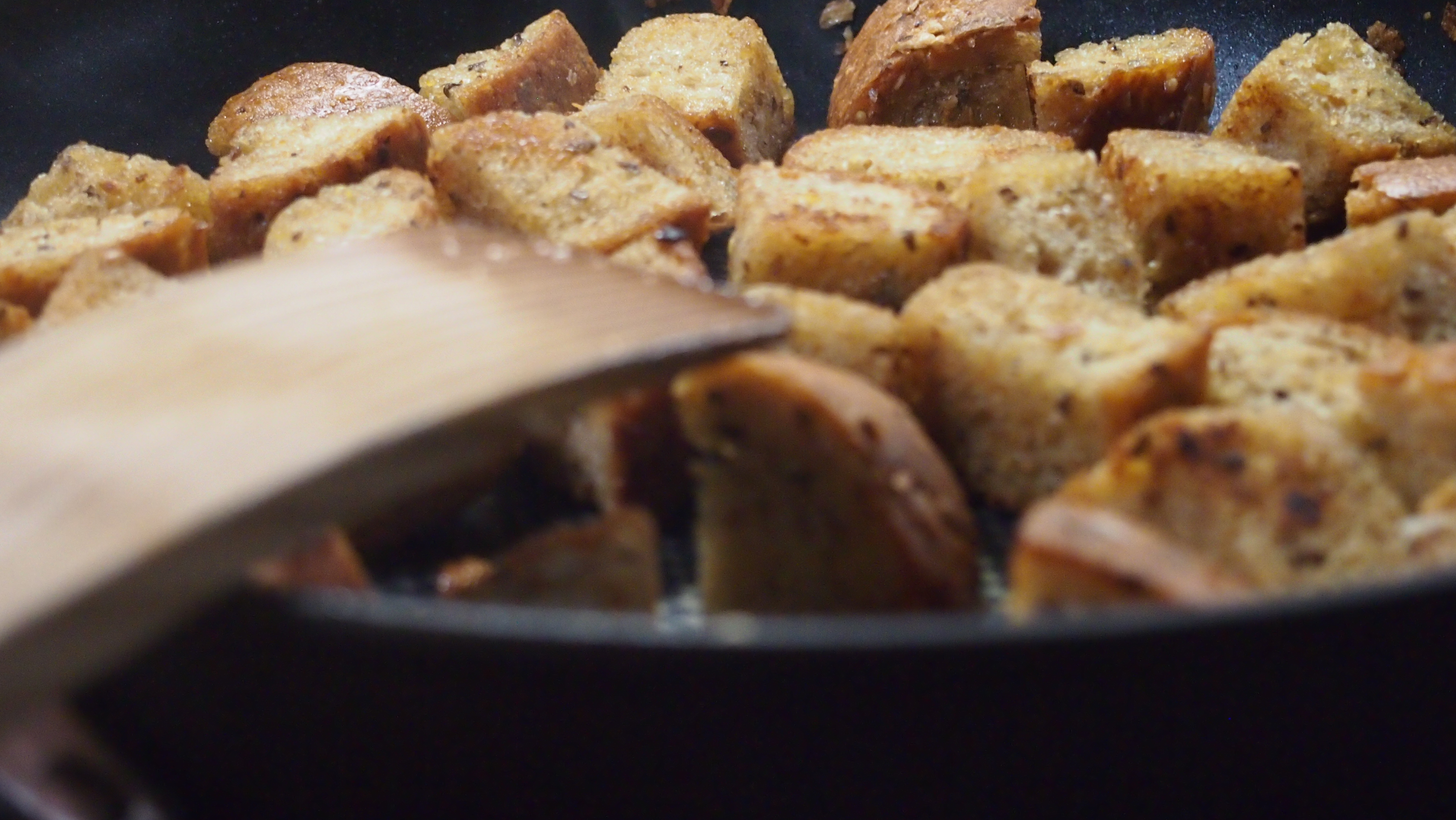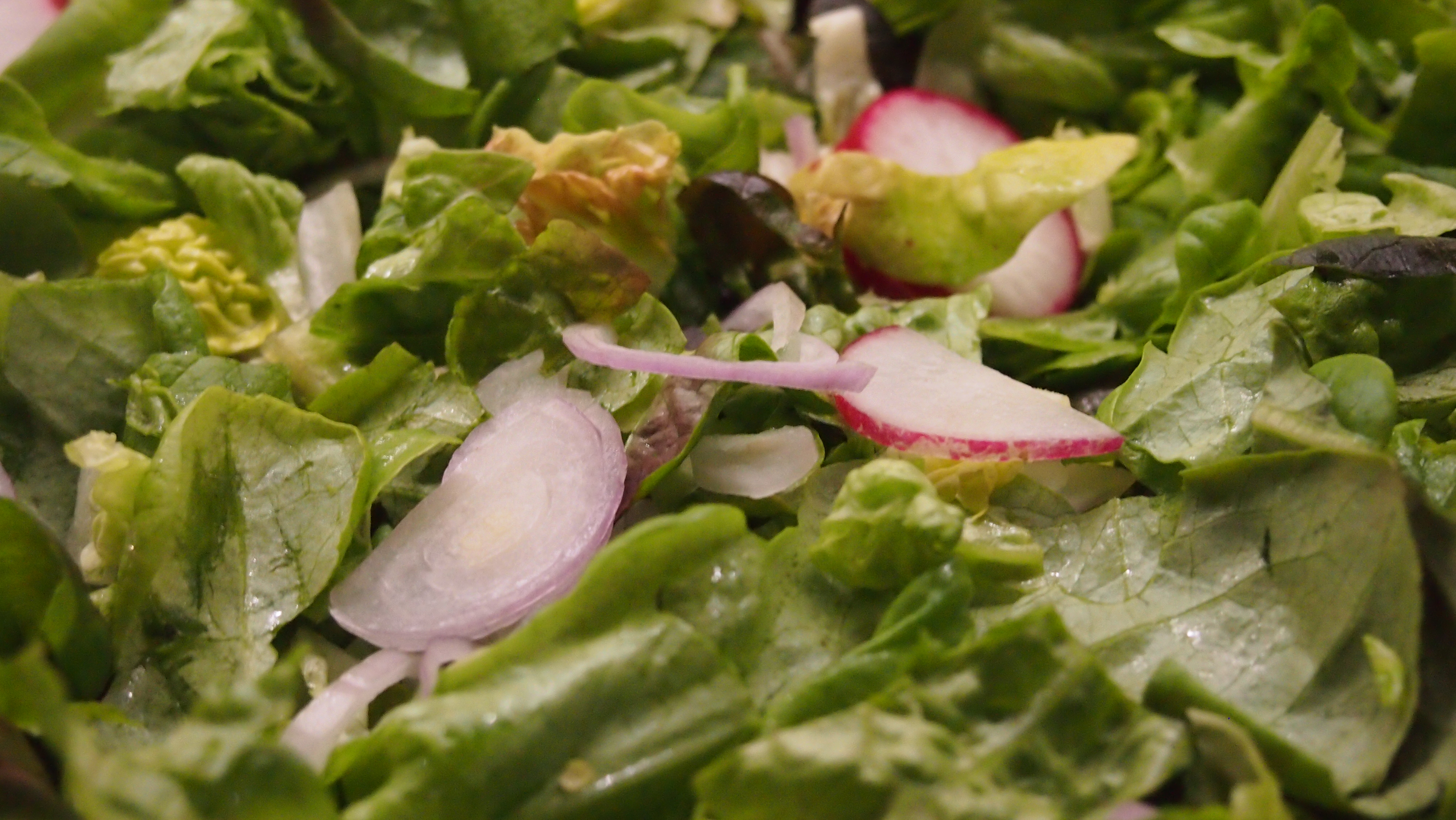 Revi salaatit kulhoon ja mausta ripauksella suolaa ja pippuria. Keitä papuja suolatussa, vähässä vedessä n. 6 minuuttia. Niiden kuuluu jäädä vielä rapsakoiksi. Huuhtele pavut lävikössä kylmällä vedellä ja anna niiden valua kuivaksi. Pavut voi leikata puoliksi, jotta ne eivät ole liian pitkiä syötäväksi. Lisää pavut, retiisi ja pilkottu kevätsipuli salaatin joukkoon. Alkuperäisessä ohjeessa leivät valmistetaan uunissa, me teimme ne pannulla, kuten krutongit. Leipä leikataan isoiksi kuutioiksi. Lorauta pannulle tilkka oliiviöljyä ja raasta valkosipulia joukkoon (me laitetaan noin puolikas yksikyntinen). Kuumenna, heitä joukkoon leipäkuutiot ja paahda miedolla lämmöllä leipiä sekoitellen niin että niistä tulee rapeita. Micke osaa hienosti heitellä niitä siinä pannulla, kuin oikea kokki konsanaan, minä en 🙂 Lisää salaattiin leipäkuutiot, pieneksi saksittu pekoni ja sekoita. Asettele viimeiseksi kananmunanlohkot. Tarjoile heti salaaatinkastikkeen kera. On meinaan herkullista!