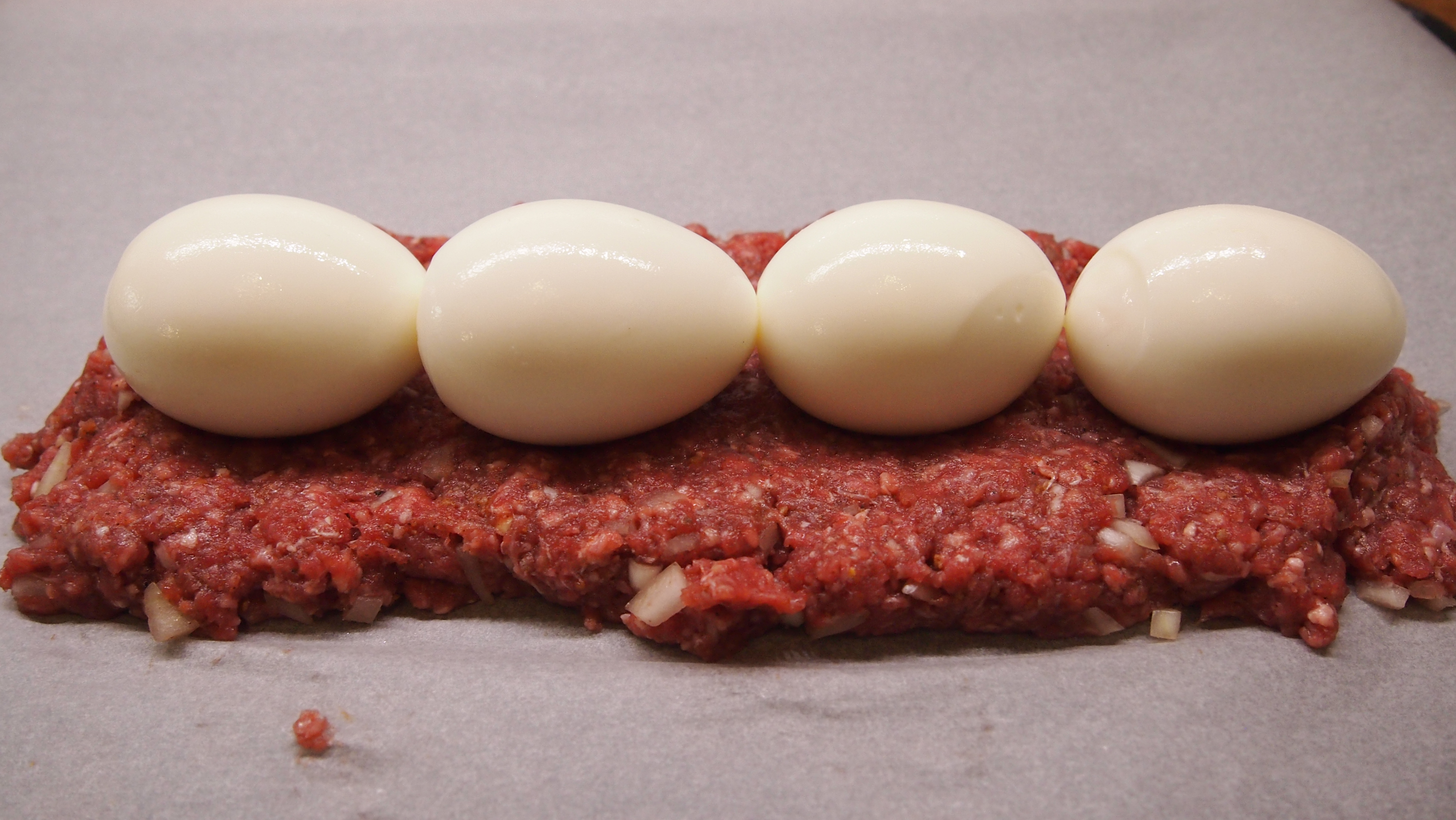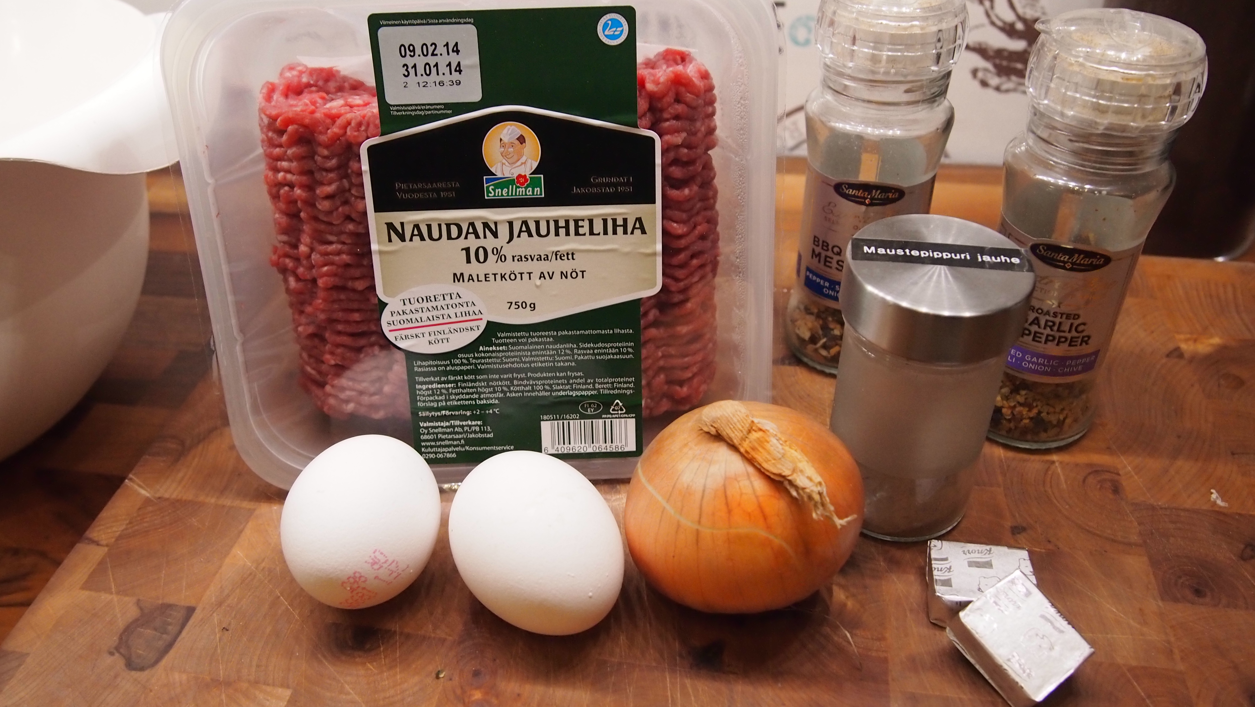 Aloitetaan perinteisestä. Keitä 4 kananmunaa kovaksi. 4 munaa mahtuu 800g mureketaikinan sisään. Valmista mureketaikina. Tähän tosiaan käytettiin 800g jauhelihaa. Kuullota 1 iso sipuli pannulla ja lisää se jauhelihan joukkoon. Riko mureketaikinaan kaksi kananmunaa ja sekoita massa tasaiseksi. Mausta mielesi mukaan, meidän taikinaan menee maustepippuria, lihaliemikuutio raastettuna, Santa Marian Garlic & Pepperiä ja BBQ & Grilliä myllystä. Muista maistaa taikinaa, että siinä on riittävästi suolaa ja muita mausteita. Aseta korkeareunaiselle uunipellille n. 1/3 taikinasta murekeen pohjaksi. Asettele kuoritut kypsät kananmunat peräkkäin taikinalle. Peitä munat lopulla taikinalla. Paista mureketta uunissa 225 asteessa n. 20 minuuttia. Perinteinen mureke tarjoillaan perunamuusin ja ruskean kastikkeen (ohje täältä) kanssa.