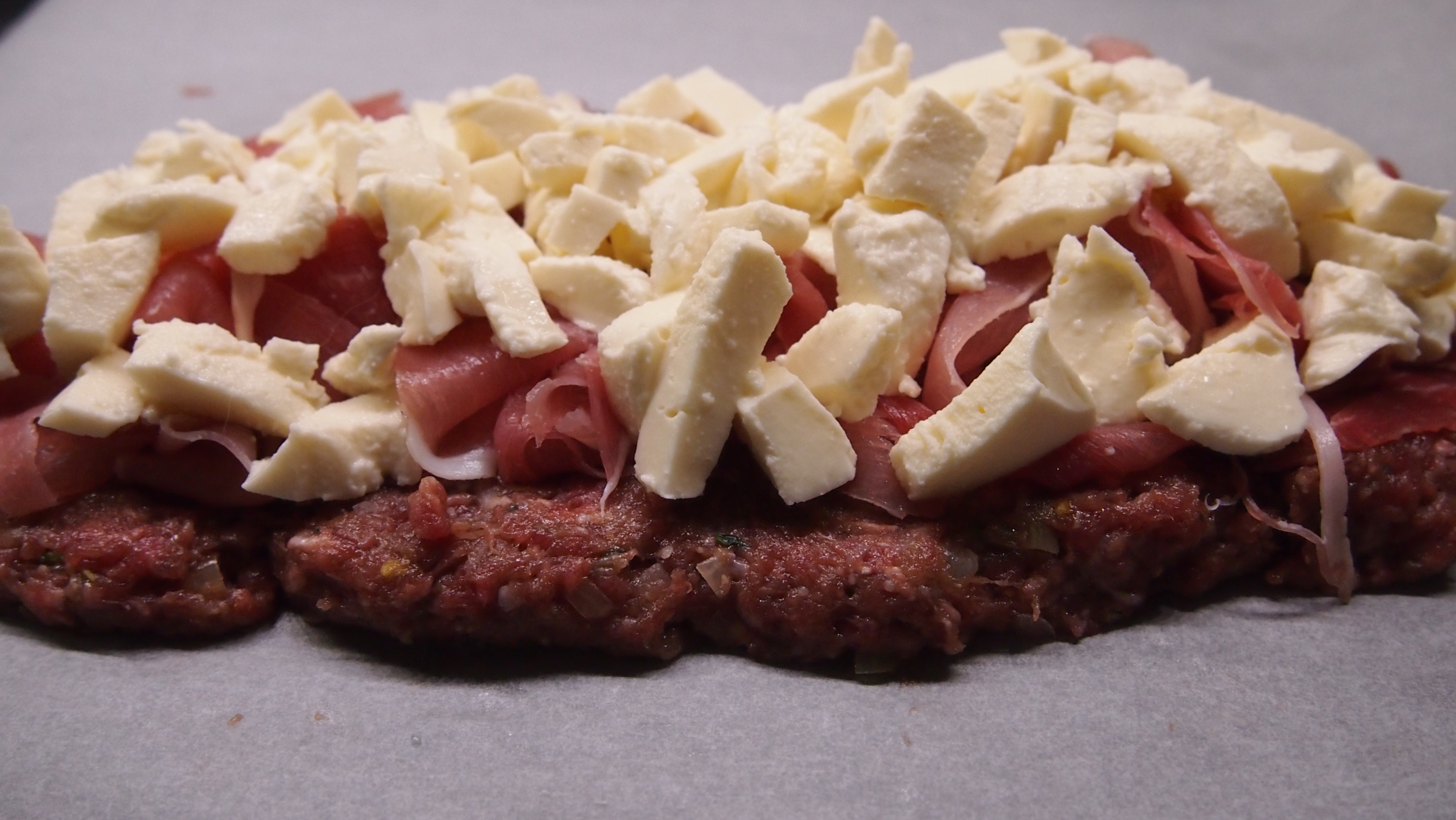Toista versiota murekkeesta voi kutsua vaikkapa Välimeren murekkeeksi. Valmistetaan taikina samalla tyylillä, 800 g jauhelihaa, 1 kuullotettu iso sipuli, raastettu lihaliemikuutio ja mausteita. Maustoimme tätä taikinaa vähän eri tavalla, vakio Santa Marian maustemyllyjen lisäksi laitettiin myös Chicken and Steak mausteseosta myllystä sekä tuoretta timjamia. Tässäkin otetaan 1/3 takinasta murekeen pohjaksi, johon ladotaan parmankinkkukekoja ja pilkottu mozzarella. Lopputaikina päälle ja uuniin.