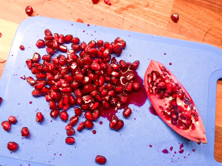 Leikkaa granaattiomena lohkoiksi ja irroittele siemenet. Varo vaatteitasi, sillä tämä on sotkuista hommaa. Kuori punasipuli ja leikkaa se ohuiksi viipaleiksi. Takista lohen maku, lisää tarvittaessa ripaus suolaa. Levitä lohiviipaleiden päälle granaattiomenansiemenet, punasipulirenkaat ja hienonnettu persilja. Valuta kalan päälle lopuksi hyvää oliiviöljyä.