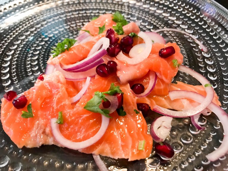 Tänä vuonna meidän kalapöydän uutuus on lohi-granaattiomenacarpaccio. Ohjeen sain sisareltani, joka ystävällisesti lähetti tämän löydön minullekin testattavaksi. Lohi-granaattiomenacarpaciossa yhdistyy ihanasti kirpeän greipin ja limen maut sekä raikas granaattiomena. Annos on kaunis ja herkullinen tarjottava ja se sopii hyvin joulupöytään tai illallisen alkupalaksi ympäri vuoden!