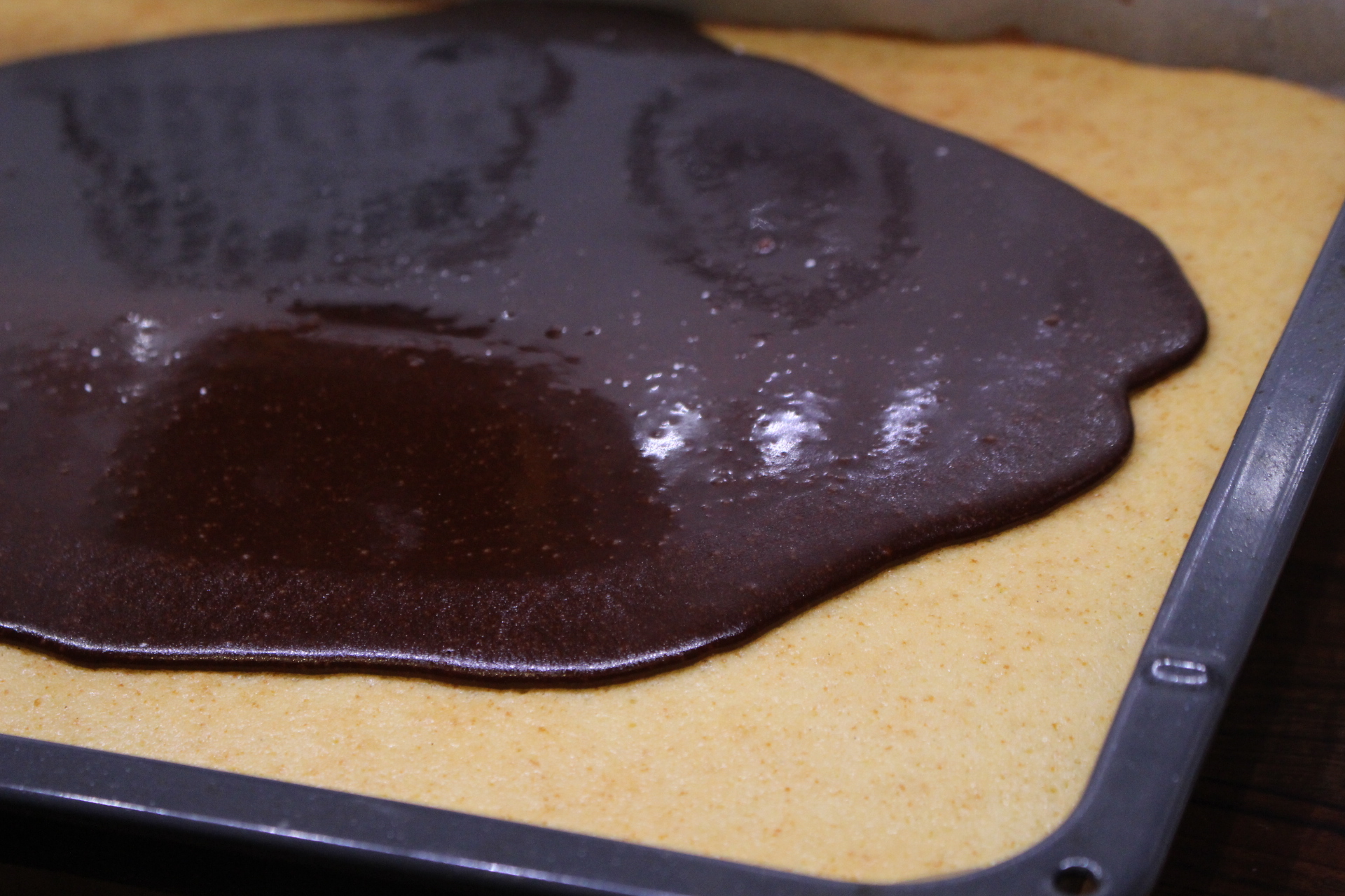 Tee seuraavaksi kuorrutus. Mittaa kaikki aineet kattilaan. Kuumenna sekoittaen kunnes seos on tasaista. Älä anna voin kiehahtaa. Ota kattila liedeltä ja anna seoksen jäähtyä välillä sekoitellen, kunnes kuorrutus paksuuntuu. Kaada puolet kuorrutteesta toisen kakkupohjan päälle. Anna jähmettyä.
