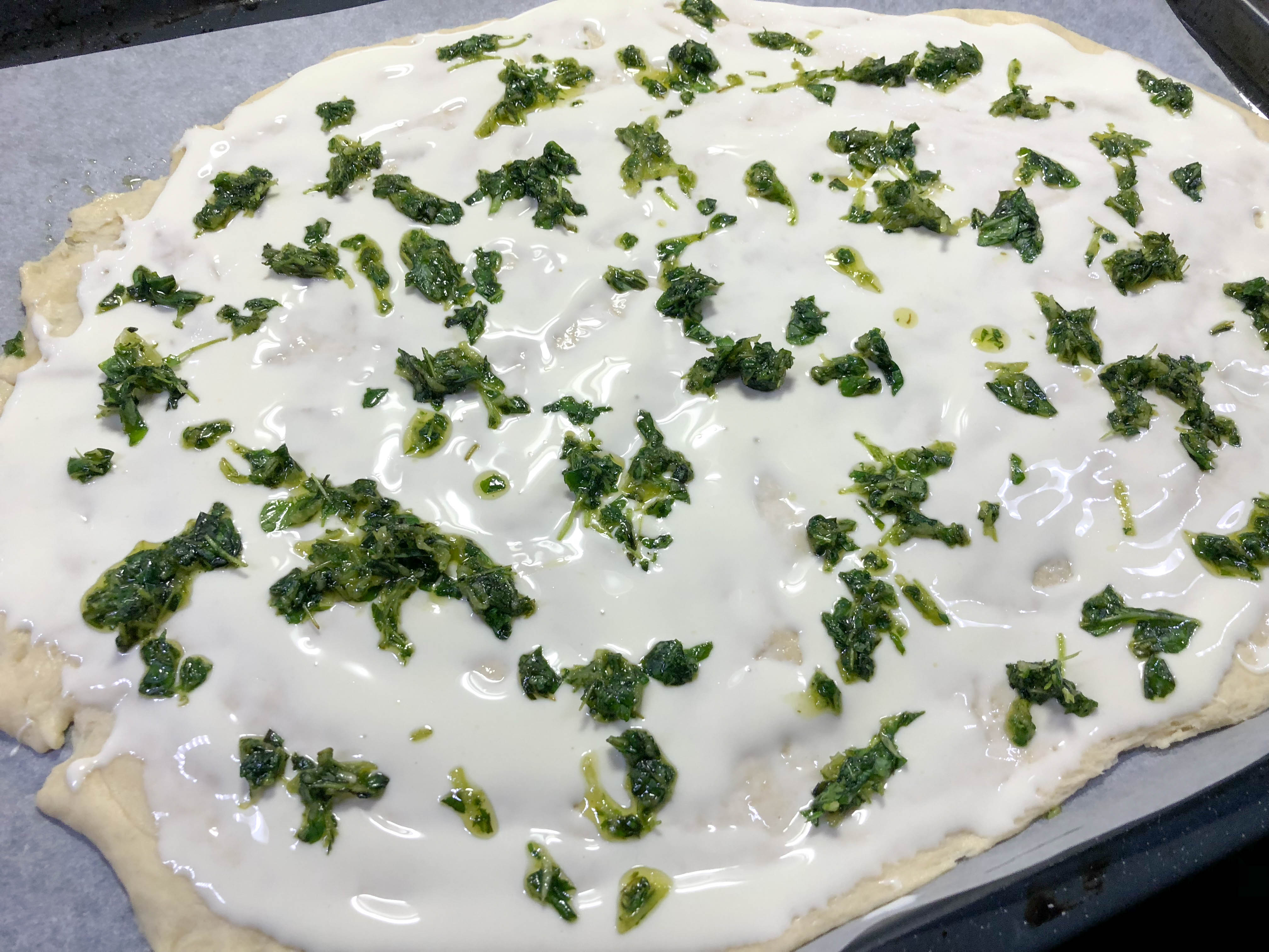 Valmista ensin pohja. Liuota hiiva 42 asteiseen veteen. Lisää suola ja öljy. Lisää taikinaan ensin puolet jauhoista ja sekoita tasaiseksi. Lisää loput jauhot vähitellen niin että taikinasta tulee kimmoisa. Anna nousta liinan alla noin 20 min.