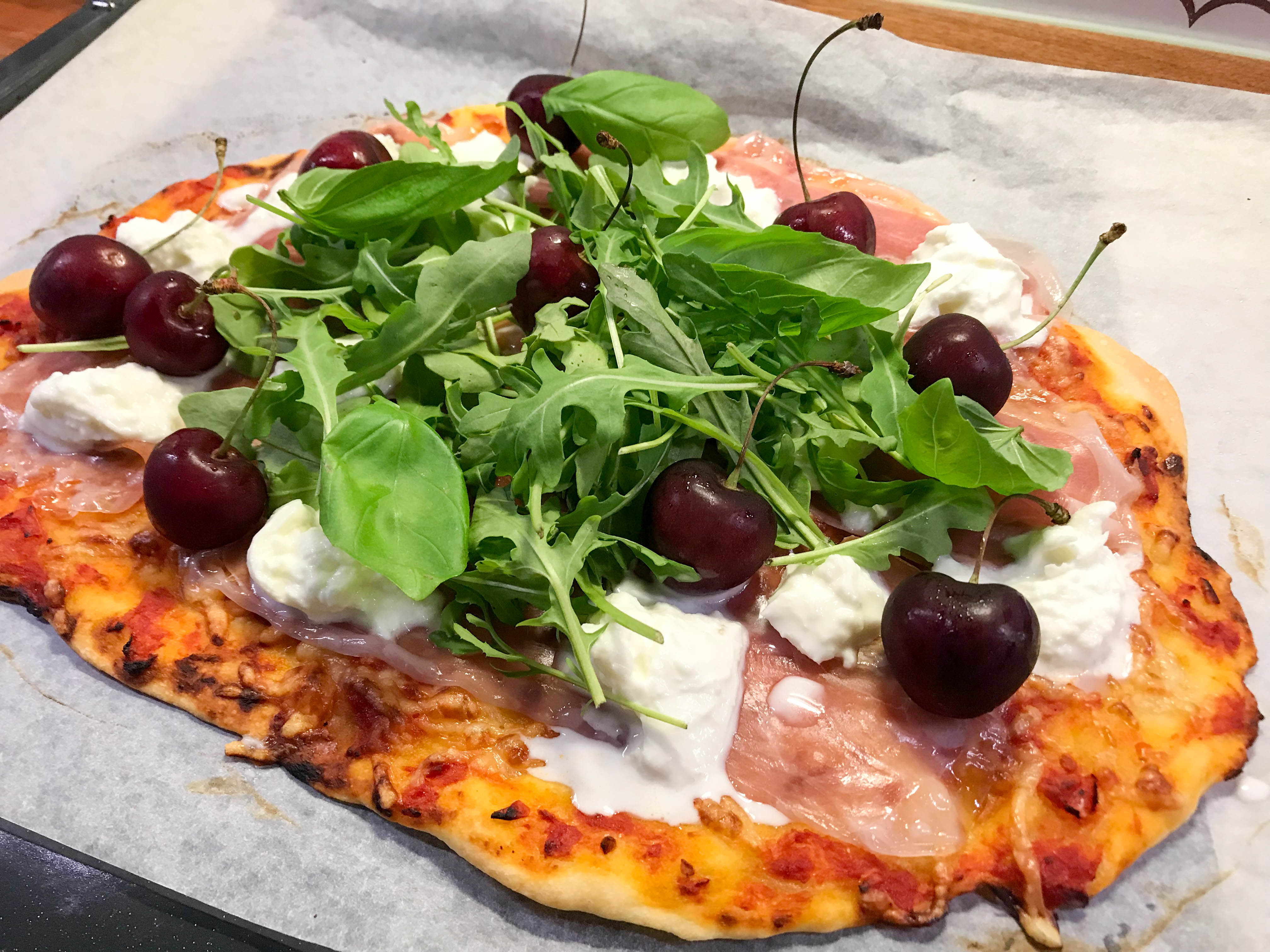 Pizzaperjantai on ehkä yksi maailman parhaista asioista! Mikä onkaan ihanampaa kuin ottaa viikonloppu vastaan lempipizzan parissa hyvässä seurassa? Vaikea on pistää paremmaksi 🙂 Parmankinkku-mozzarella-rucolapizza on yksi suosikeistani ja tämän kesäisen pizzan kruunaa tuore kirsikka. Makea kirsikka ja suolainen kinkku toimivat totta kai loistavasti yhteen. Tässä ohjeessa on suosikkipohjamme sekä maailman paras tomaattikastike ja ne ihan parhaat täytteet. Tästä ei pizza paljon parane!