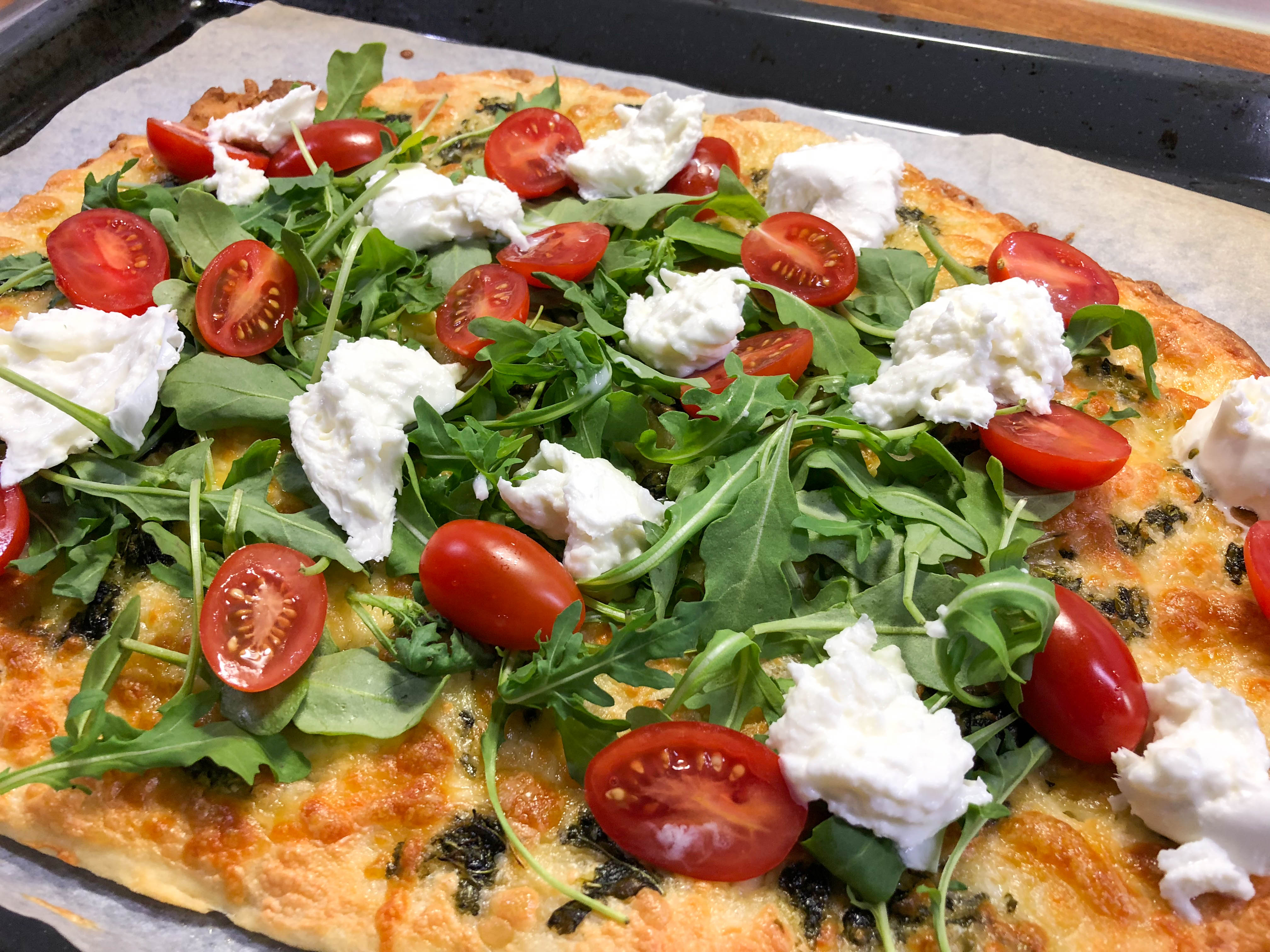 Revi pizzalle paiston jälkeen mozzarellat sekä ripottele joukoon puolitetut kirsikkatomaatit sekä rucola. Viimeistele pizza halutessasi vihreällä tabascolla ja nauti pizzasta heti!