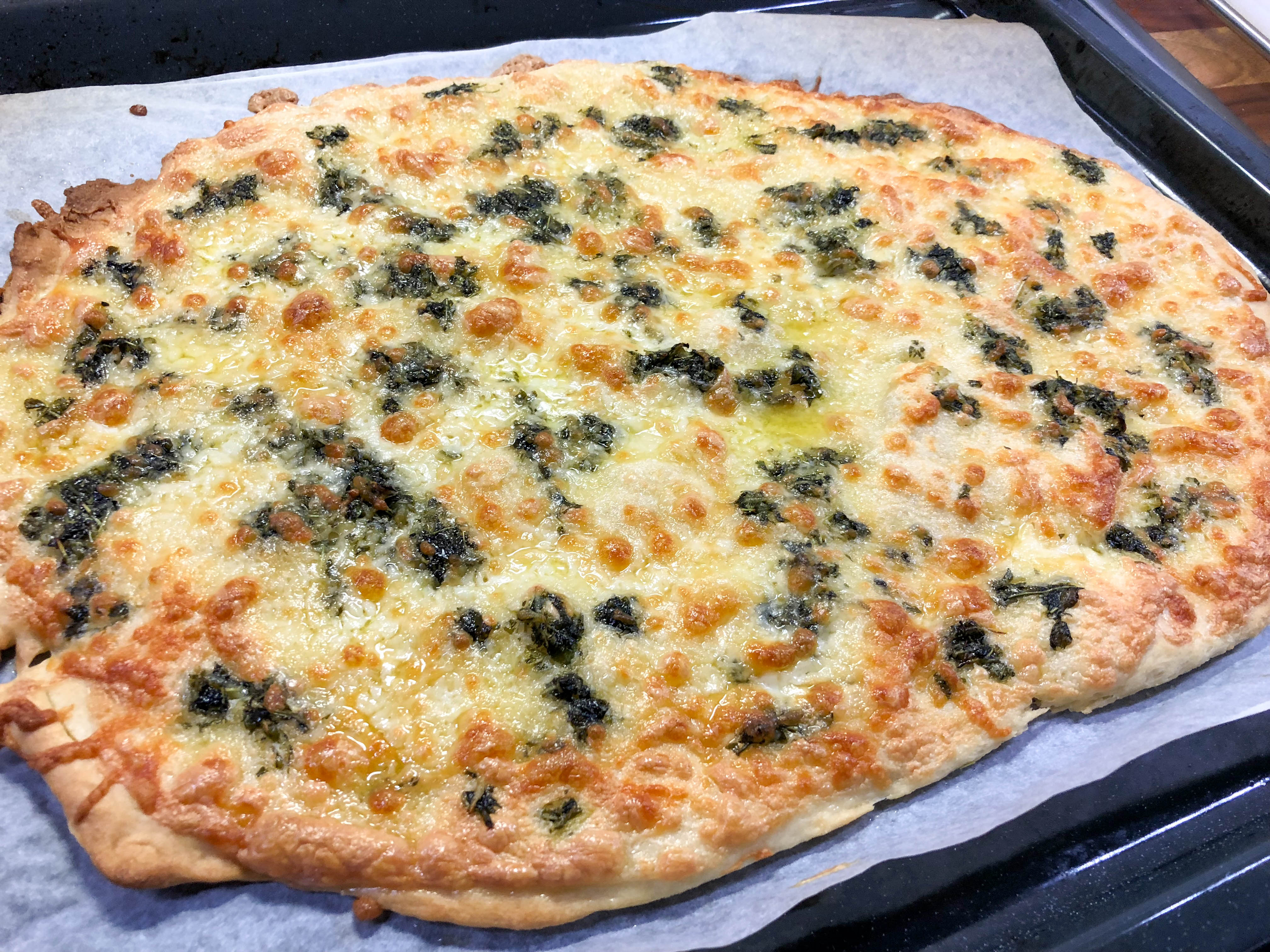 Valmista ensin pohja. Liuota hiiva 42 asteiseen veteen. Lisää suola ja öljy. Lisää taikinaan ensin puolet jauhoista ja sekoita tasaiseksi. Lisää loput jauhot vähitellen niin että taikinasta tulee kimmoisa. Anna nousta liinan alla noin 20 min. Me testasimme tähän pizzaan ensimmäistä kertaa erikoishienoja 00-jauhoja ja annoimme pohjan nousta huoneenlämmössä 12 tuntia.