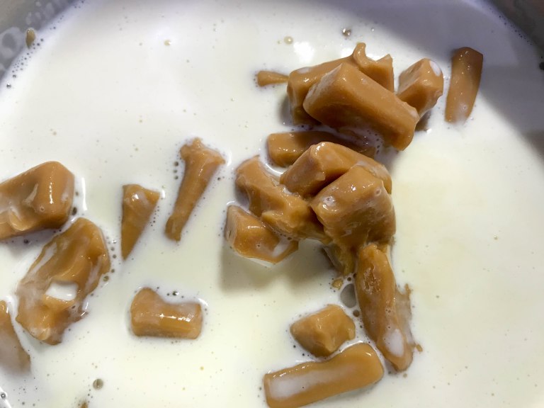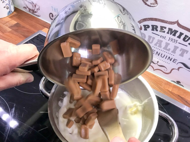 Valmista ensin kuorrute. Kuori Omar mokkapalamakeiset. Kaada kerma kattilaan ja lisää joukkoon mokkapalamakeiset. Kuumenna kokoajan sekoittaen niin kauan kunnes karkit ovat sulaneet kerman joukkoon. Älä anna kiehua. Anna seoksen jäähtyä kädenlämpöiseksi ja nosta seos sitten jääkaapiin. Kerma- makeisseoksen on hyvä tosiaan antaa jäähtyä yön yli.