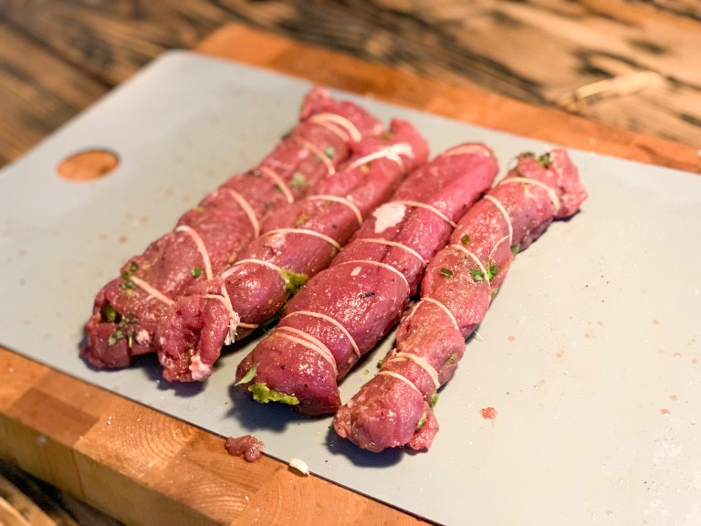Yrteillä, pähkinöillä ja aprikooseilla täytetty karitsanfile 4lle