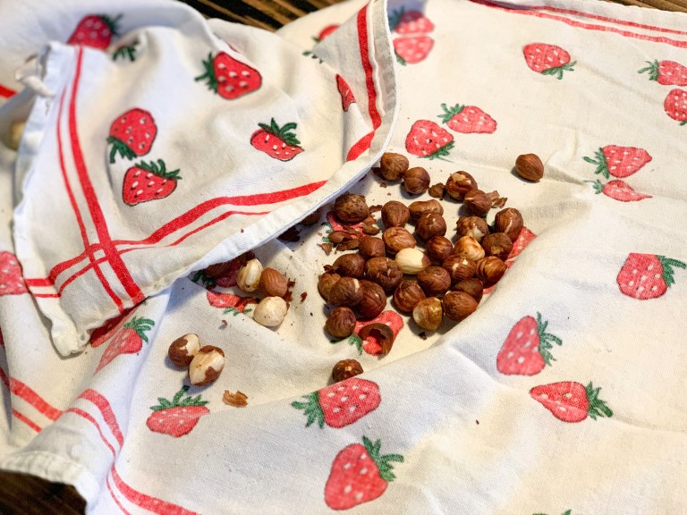 Paahda hasselpähkinät pannulla, kunnes ne alkavat saada väriä. Kumoa ne puhtaan keittiöpyyhkeen päälle ja rullaa pähkinöitä pyyhkeen välissä. Näin kuoret irtoavat pähkinöistä. Kaikki kuoret eivät tälläkään keinolla lähde, mutta se ei haittaa.