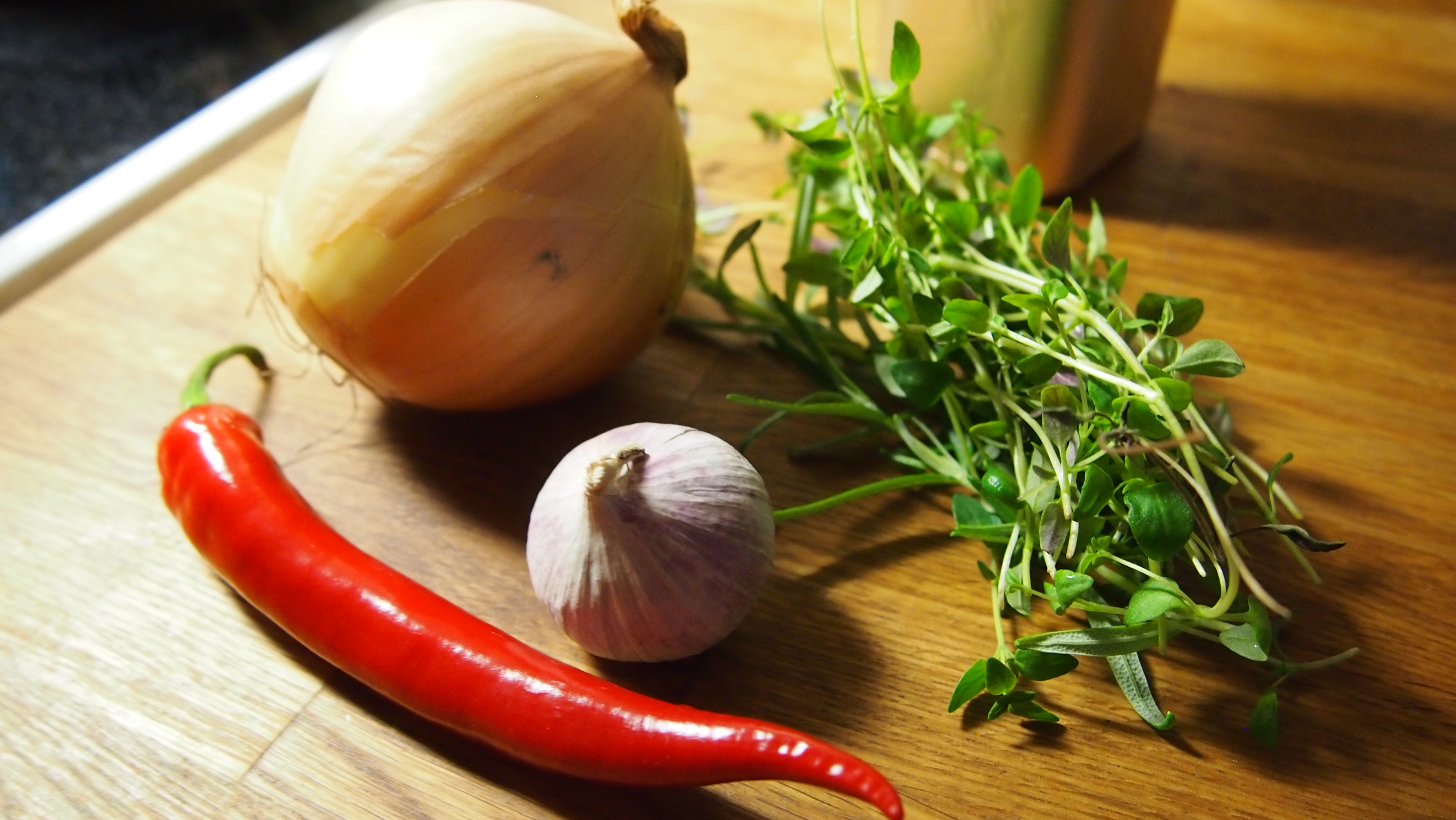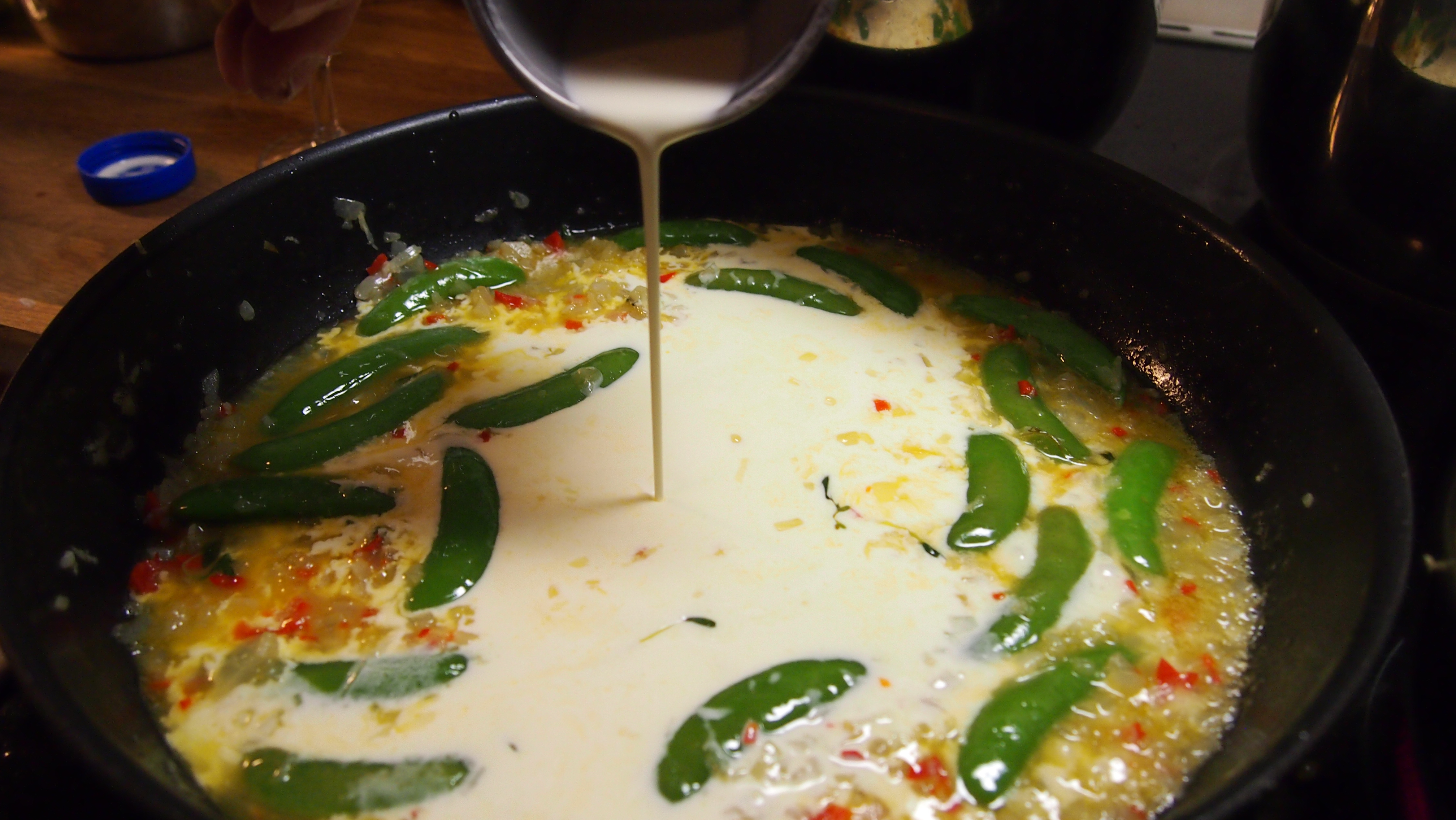 Tämä pasta syntyi lauseesta ”missä se poro on?!” Lounaaksi piti olla porokeittoa, mutta kah, poro unohtui kauppaan. Olimme mökillä saaressa, joten ruuaksi valmistui ”yllätyspasta” niistä aineksista mitä oli saatavilla. Olemme omaksuneet pastaopit Safkaa -kirjoista hyvin ja tämä onkin selkeä mukaelma kirjan resepteistä. Kasvimaalla viihtyi onneksi vielä rosmariinia sekä muutama papu, loput ainekset löytyivät kaapeista.