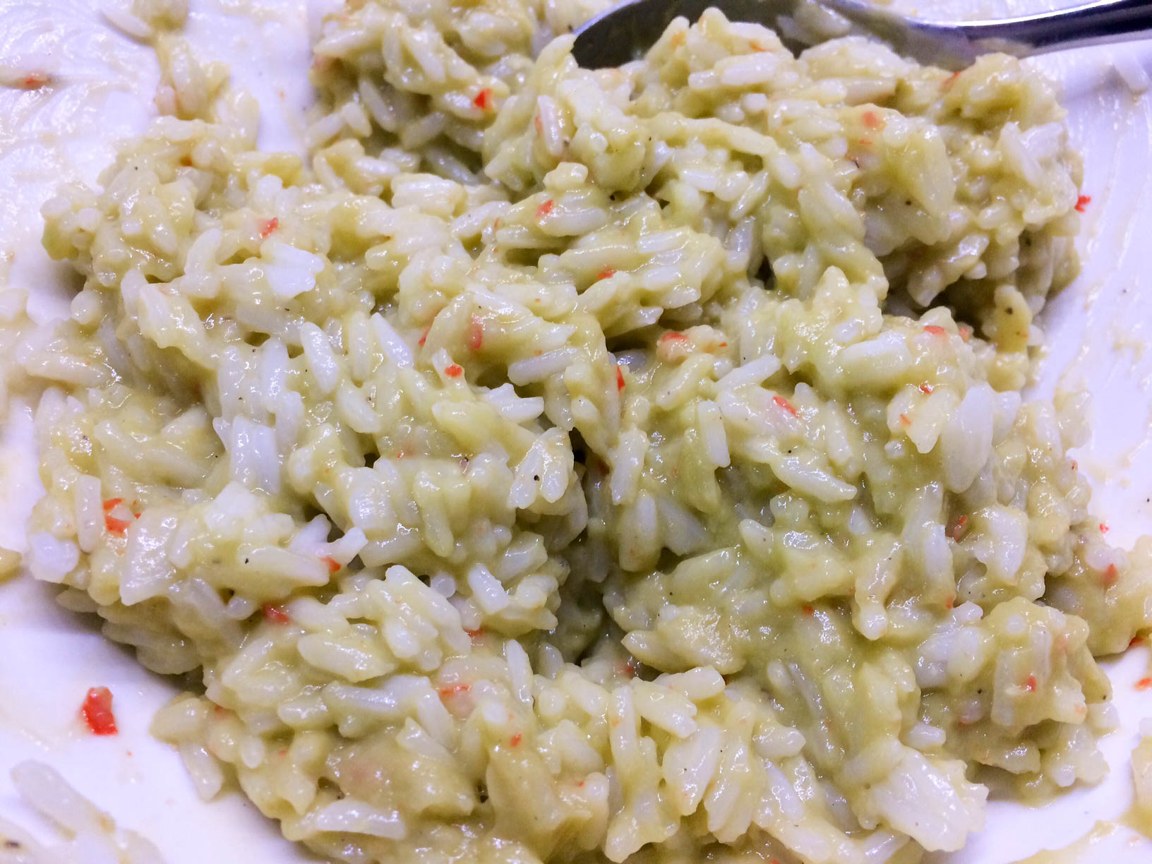 Viipaloi kesäsipulit varsineen (talvella käytämme tähän kevätsipulia). Kuori ja viipaloi valkosipulinkynnet. Kuullota sipuleita pannulla öljyssä miedolla lämmöllä muutama minutti. Huuhtele riisiä tiiviissä siivilässä kylmällä vedellä, kunnes huuhteluvesi on kirkasta. Valuta ja lisää riisi pannulle öljyn kanssa. Kuullota muutama minuutti sekoitellen. Lisää joukkoon kuuma kasvisliemi, kuumenna kiehuvaksi ja alenna sitten lämpöä. Keitä kannen alla riisipakkauksen ohjeen mukaan, kunnes riisi on kypsää. Mausta pippurilla. (Kun riisi on ihan paria minuuttia vaille valmis, ala paistelemaan rapuja.)