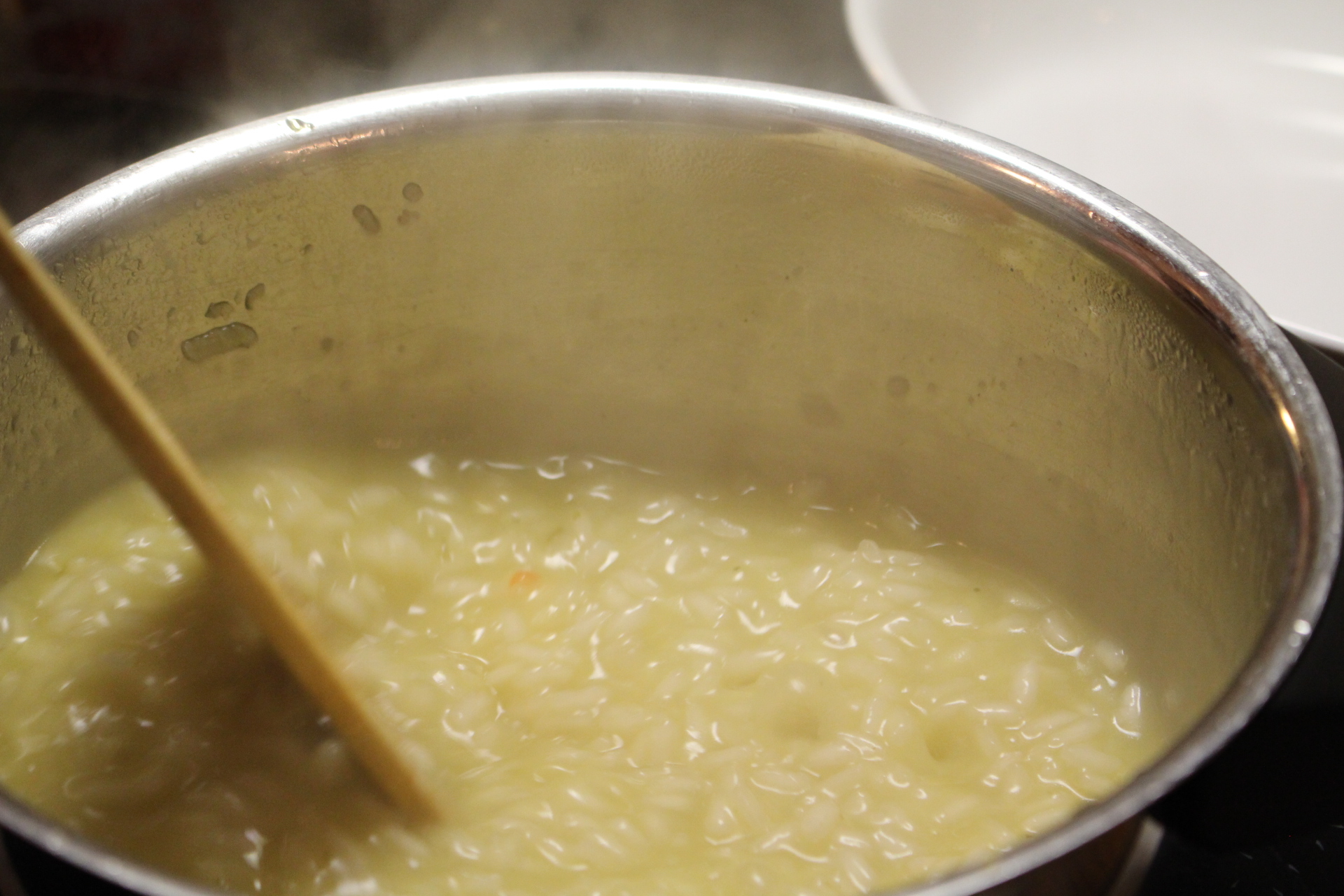 Seuraavaksi valmistetaan risotto. Kuori ja hienonna sipuli. Lämmitä kattila, lisää öljy ja nokare voita. Kuullota sipuli. Lisää sipulin joukkoon riisi ja kuullota 2–3 minuuttia, kunnes riisin ulkokuori näyttää läpikuultavalta. Lisää valkoviini ja anna riisin imeä se. Lisää kuumaa kasvislientä kauhallinen kerrallaan. Sekoita riisiä jatkuvasti ja lisää nestettä vasta kun riisi on imenyt edellisen kauhallisen.