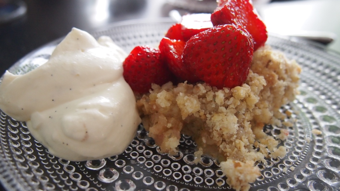 Crumblen ollessa uunissa valmista tuorejuustovaahto. Lisää kaikki ainekset kulhoon ja vatkaa kuohkeaksi vaahdoksi. Perkaa ja pilko mansikat omaan kulhoonsa. Kun crubmle on valmis, tarjoile se lämpimpänä yhdessä tuorejuustovaahdon ja mansikoiden kanssa.