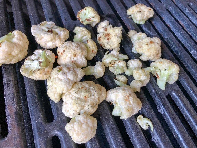 Mittaa kastikkeen öljy ja etikka kulhoon. Raasta joukkoon inkivääri ja valkosipuli. Mausta sinapilla, hunajalla, suolalla, pippurilla ja basilikalla. Grillaa seuraavaksi kukkakaaleja n. 20 min välillä käännellen. Grillaa lopuksi hetki myös parmankinkkkusiivuja. Lisää tarjoiluastialle kukkakaalit, kinkut, tomaatit, parmesanlastut ja siemenet. Tarjoile salaatti kastikkeen kanssa.