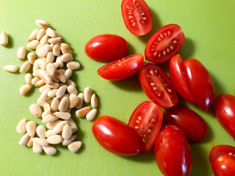 Irrota kukkakaali kukinnoiksi, puolita isoimmat kukinnot. Laita kukkakaalit kulhoon ja kääntele palat öljyssä. Paahda siemeniä kuivalla pannolla kohtalaisella lämmöllä kunnes ne saavat vähän väriä. Puolita kirsikkatomaatit ja leikkaa parmesaani lastuiksi. Revi salaatti ja asettele se tarjoiluastialle.