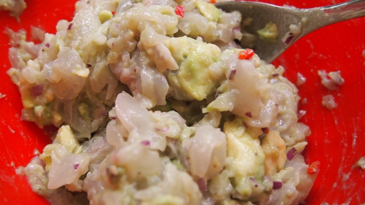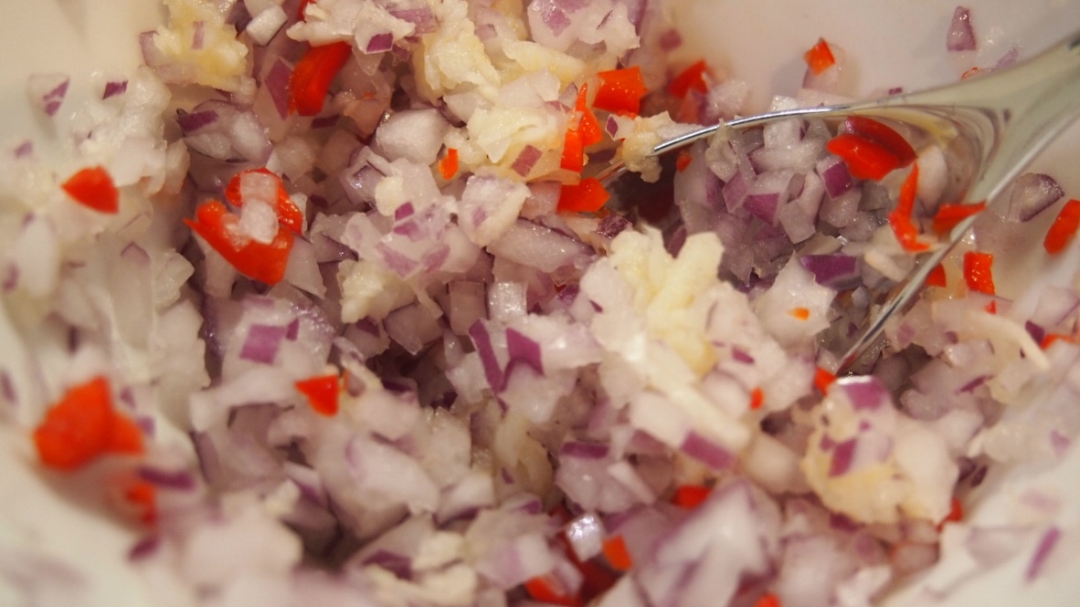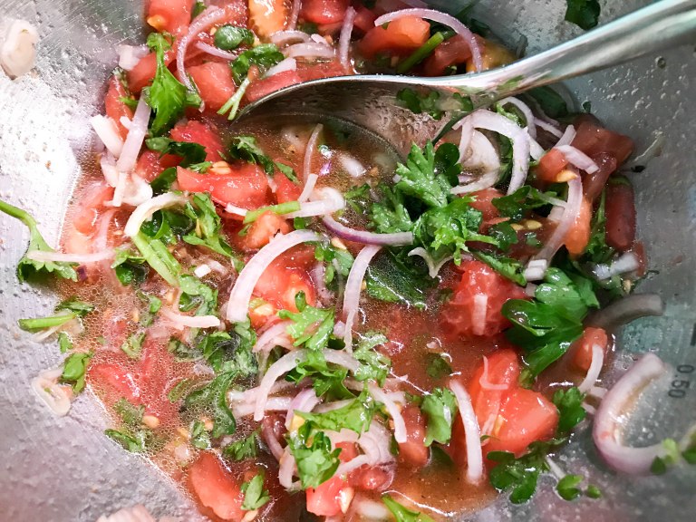 Tee ensin escabeche -kastike. Pilko tomaatit pieniksi kuutioiksi. Hienonna sipulit, valkosipuli ja persilja. Sekoita kaikki kastikkeen ainekset keskenään. AIka hapokas kastike on meidän mieleen, joten meidän kastikkeeseen päätyy tuo 2 rkl valkoviinietikkaa. Laita kastike maustumaan jääkaappiin.