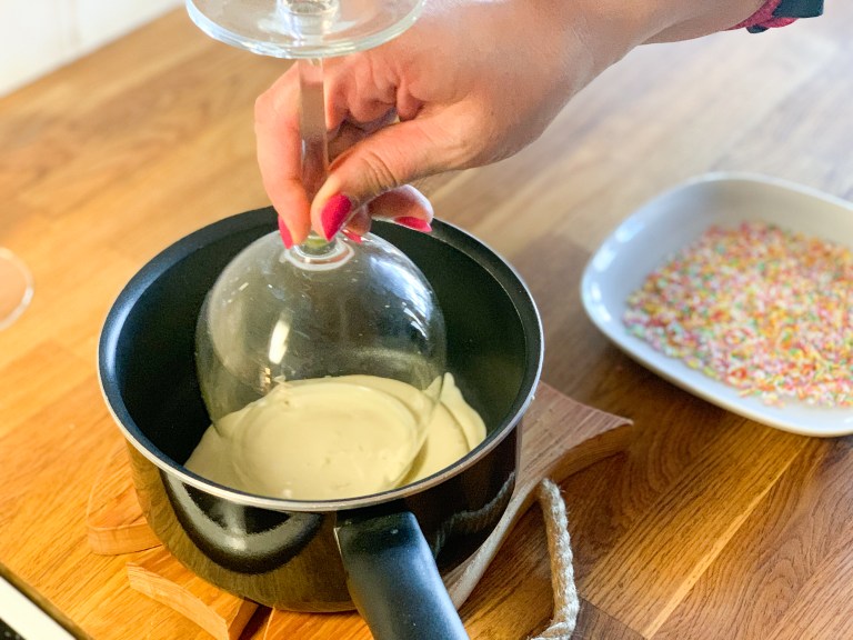 Sulata valkosuklaa kattilassa miedolla lämmöllä. Kaada strösseliä laakealle lautaselle. Kasta lasien reunat valkosuklaaseen ja dippaa strösseleihin. Anna jähmettyä jääkaapissa n. 1 tunti.