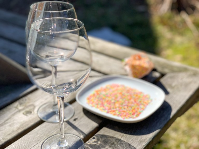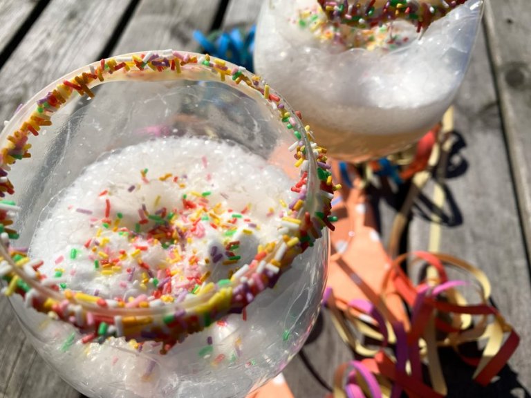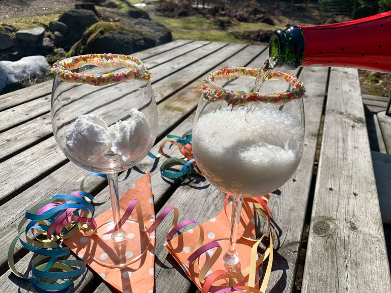 Hei kuinka kiva tervetuliaismalja tai kesäpäivän herkuttelujuoma tämä värikäs sorbettimimosa onkaan! Lasiin tehdään margaritasta tuttu koristelu, mutta vähän eri tyylillä! Lasi kastetaan sulatetussa valkosuklaassa ja dipataan värikkäisiin strösseleihin. Tämä tyyli puhuttelee erityisen paljon nonparellifania! Juomassa kuohuvan kaverina maistuu raikas sitruunasorbetti. Vinkki juomaan löytyi kevään 2019 Me Naiset lehdestä.