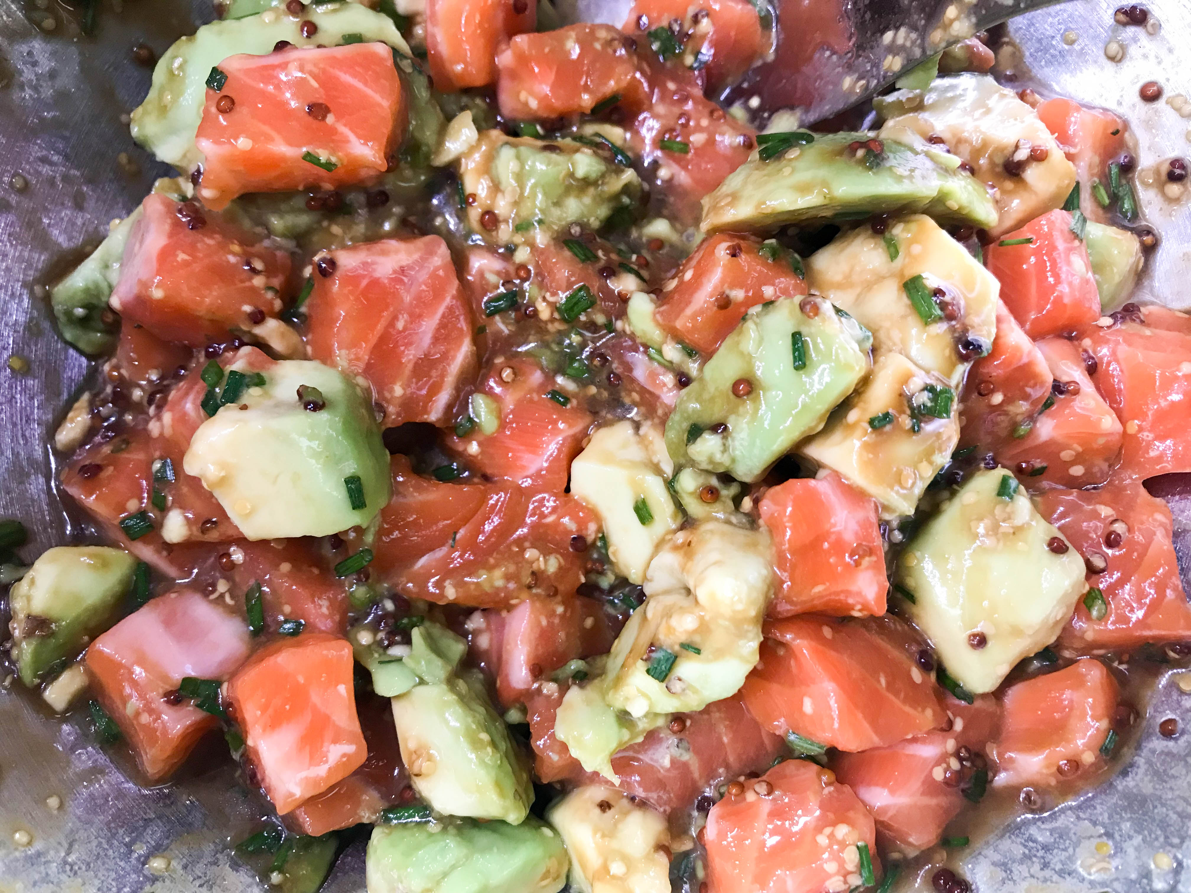 Hienonna kylmäsavulohi pieneksi kuutioksi. Silppua myös sipuli ja lisää kalan joukkoon. Silppua joukkoon myös ruohosipuli ja tilli ja mausta sitruunan mehulla ja mustapippurilla. Sekoita ja anna maustua hetkinen. Tarkista maku ja lisää tarvittaessa suolaa ja pippuria.