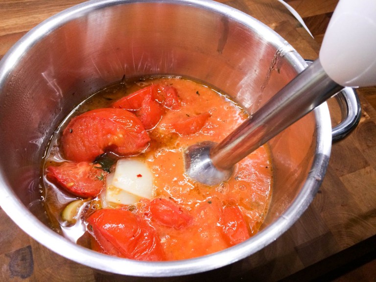 Valmista ensin keitto. Kuori ja paloittele sipuli. Kuori ja hienonna valkosipulinkynnet ja inkivääri. Kuumenna öljy kattilassa ja kuullota sipuleita ja inkivääriä miedolla lämmöllä 3 minuuttia. Lisää paprikajauhe ja jatka kuumenusta vielä pari minuuttia. Kaada molemmat tomaattitölkit kattilaan.