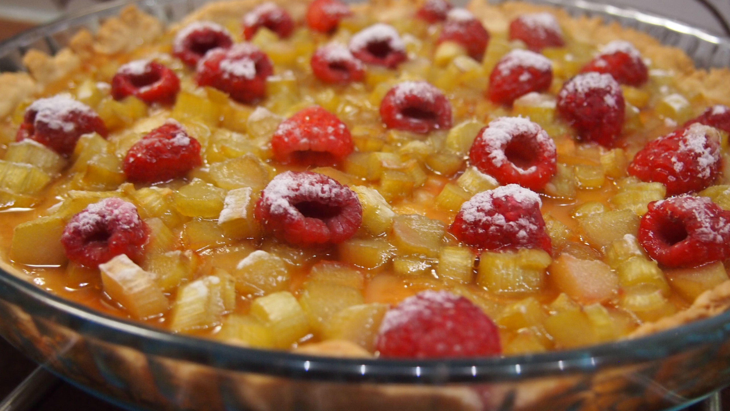 Huuhtele raparperit, kuori ja paloittele ne ohuiksi viipaleiksi. Laita raparperiviipaleet taikinan päälle ja asettele sekaan kokonaiset vadelmat. Sekoita sokeri ja perunajauhot ja sirottele ne tasaisesti raparperien ja vadelmien päälle. Voit lisätä vielä lorauksen siirappia tuomaan makeutta, raparperi kun on aika kirpeä kaveri. Paista 225 asteessa uunin keskitasolla noin 30 minuuttia. Nautitaan sellaisenaan tai vaniljakastikkeen tai vaniljajäätelon kera. Ihanan raikas ja sopivan makea, vanhan ajan makujen piirakka!