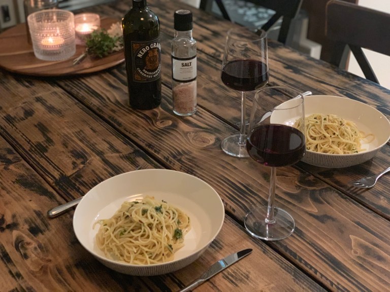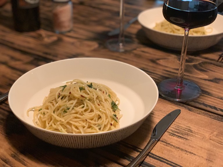 Tämä pasta on aineksiltaan hyvin yksinkertainen mutta sitäkin herkullisempi! Meidän kaapista tähän löytyy myös aina tarvikkeet, vaikka tätä ruokaa ei oltaisi etukäteen suunniteltukaan. Mahtava ruoka siis senkin takia! Olemme valkosipulin suuria ystäviä ja laitoimme kahden hengen satsiin kaksi pientä yksikyntistä valkosipulia. Se voi olla jonkun makuun paljon, niin vähempikin määrä riittänee. Toki tämä ruoka vaatii paljon valkosipulia, joten kannattaa kokeilla reilullakin määrällä 🙂