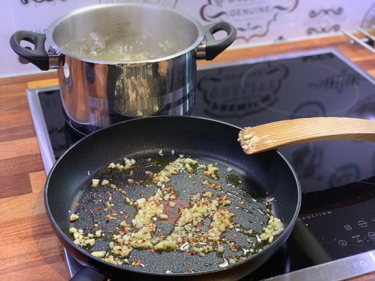 Kuori ja pilko valkosipulit pieneksi silpuksi. Lorauta oliiviöljy pannulle ja kuumenna sitä hetki puoliteholla. Lisää joukkoon valkosipulit ja chilihiutaleet ja anna niiden tiristä öljyssä hiljalleen. Muista pitää pannu miedolla lämmöllä, jotta valkosipuli ei pääse kärähtämään! Laita tässä vaiheessa myös spaghettivesi kiehumaan ja keitä spaghetti pakkauksen ohjeen mukaan. Spaghetin kiehuessa raasta parmesan. Mausta öljyssä kiehuvat valkosipulit suolalla.