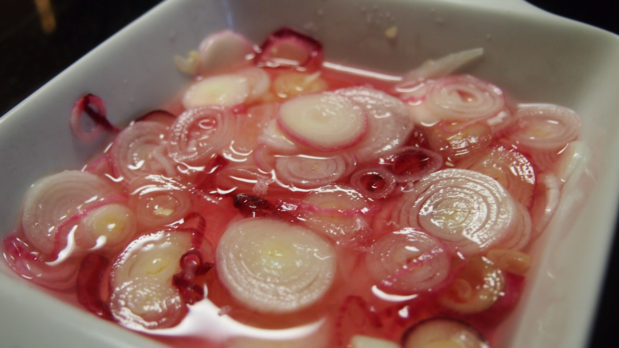 Salaattiin tulee marinoitua punasipulia, jonka täytyy ehtiä maustumaan, joten siitä on hyvä aloittaa.