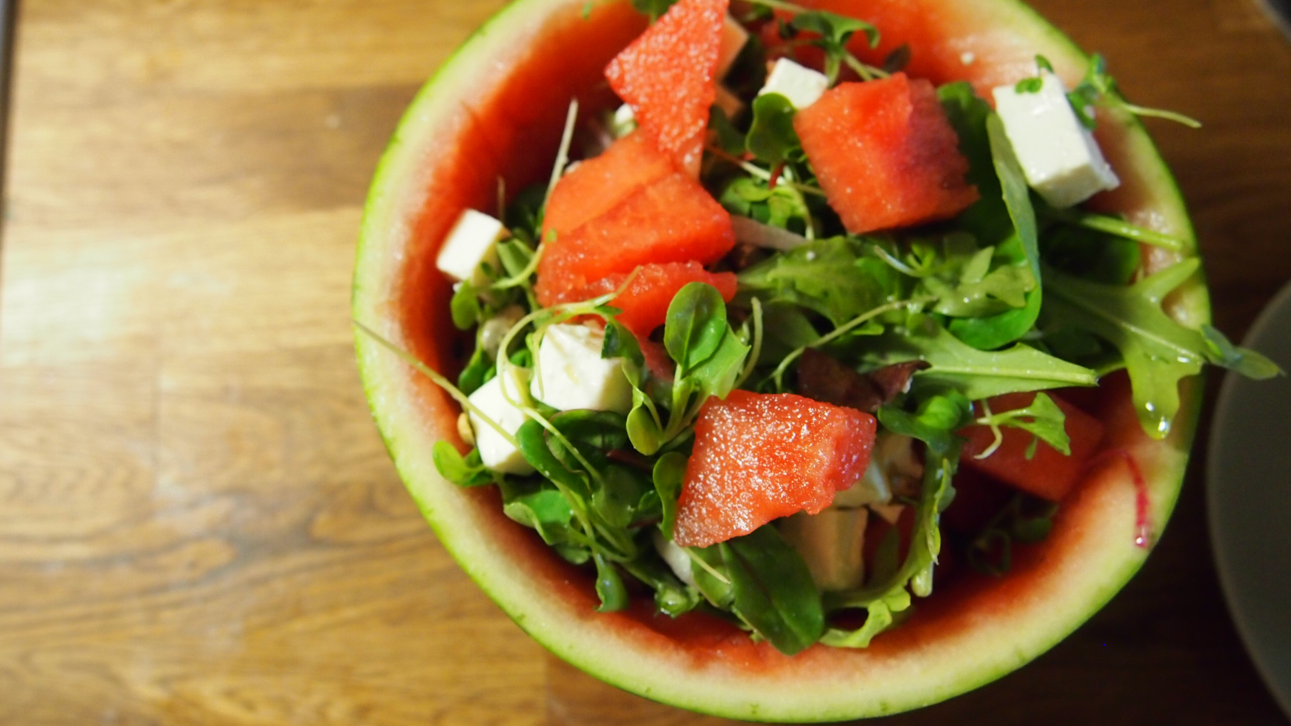 Vinkki! Vesimelonkikupista kannattaa leikata pohjasta pieni, ohut siivu pois niin alustasta tulee tasainen ja salaattikulho pysyy pysyssä.